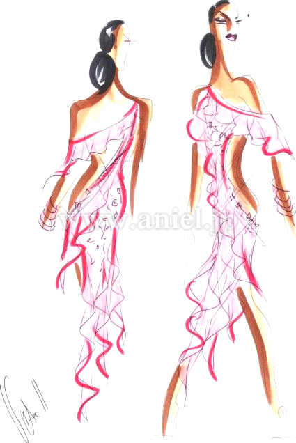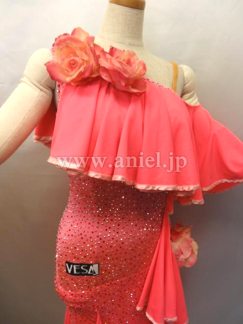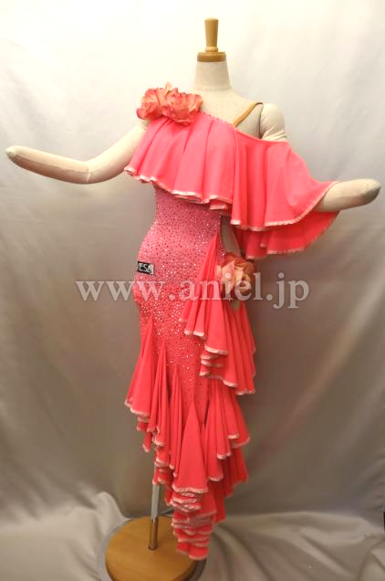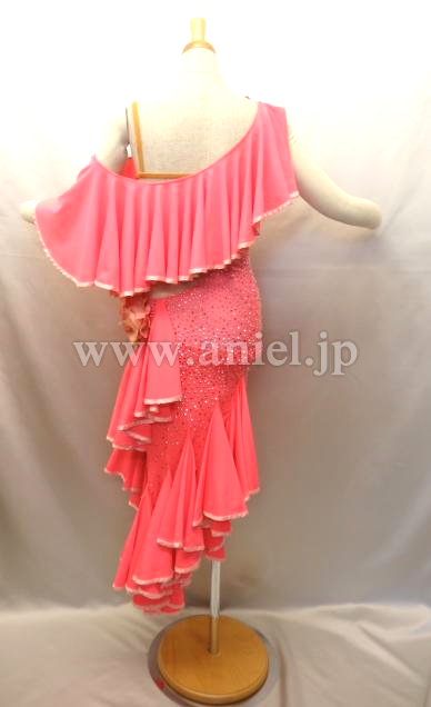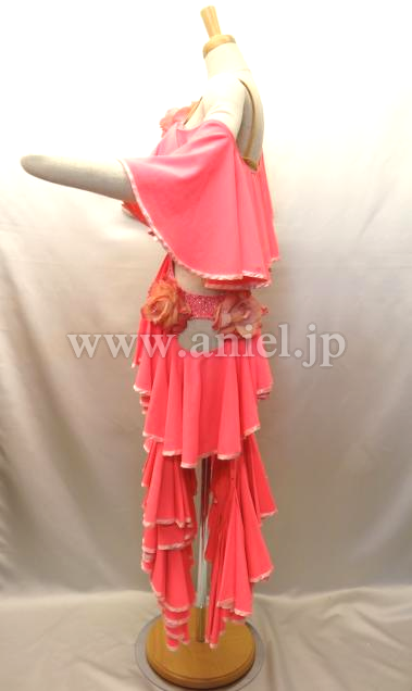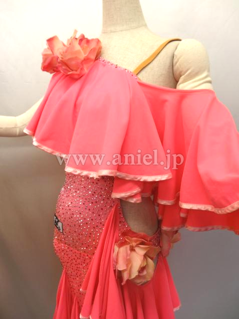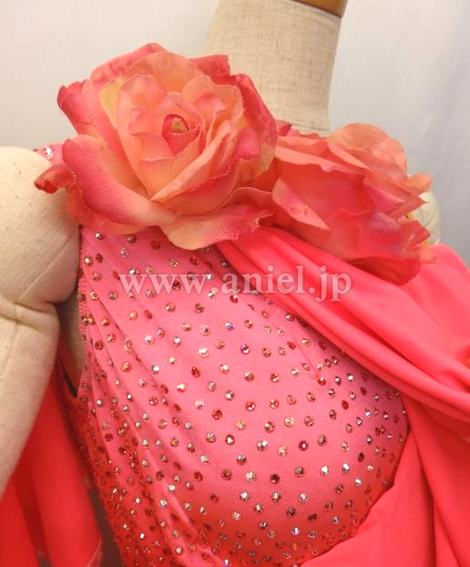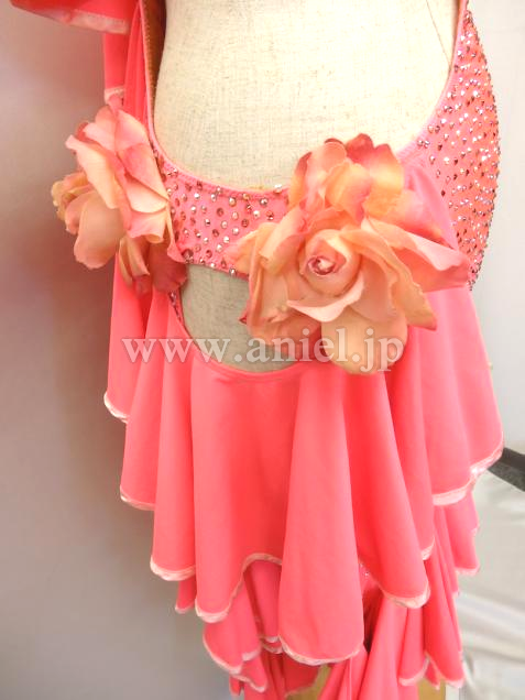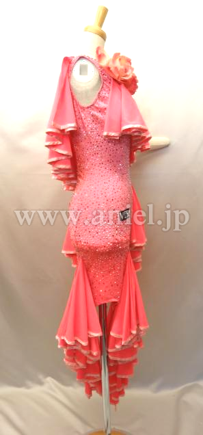 斜めにかけられたフリルが動くとよく舞います。ボディはオーロラとピンクのスワロフスキーストーンが散りばめられています。