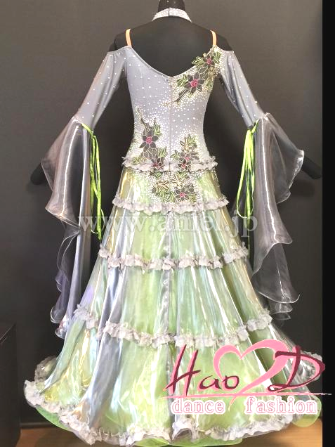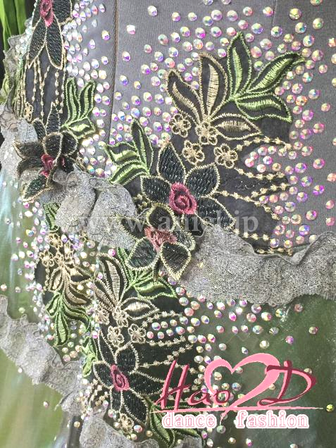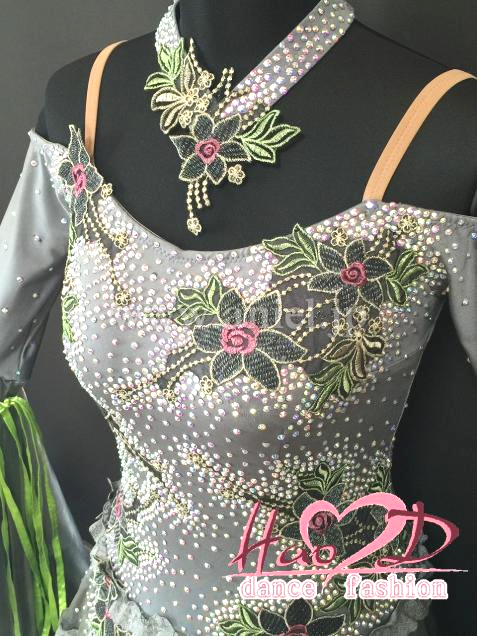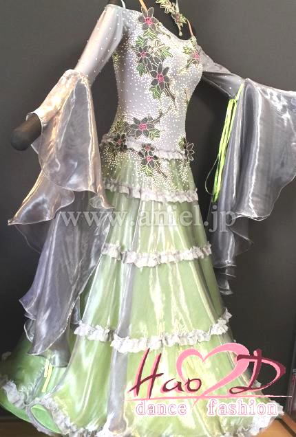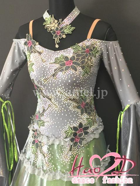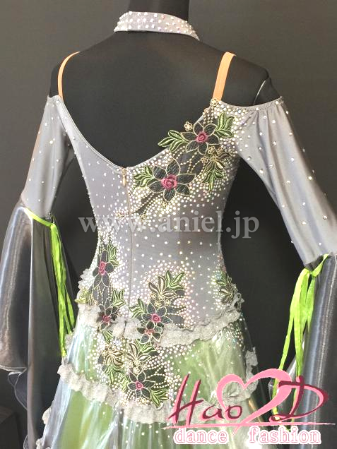 身頃はモチーフで斜めのジグザグラインを作り、ボディーをシャープに見せ、周りに石をグラデーションに散らして大変豪華;