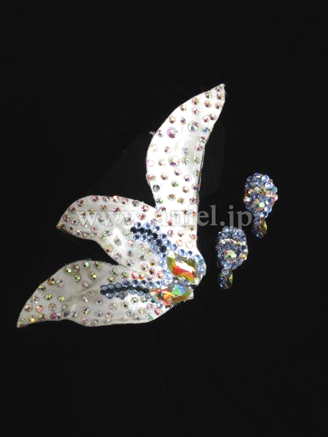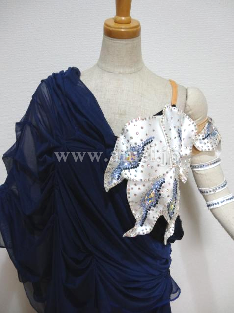大きなドレープが全体にかかるデザインです。胸元の大きなホワイトモチーフがワンポイントです。