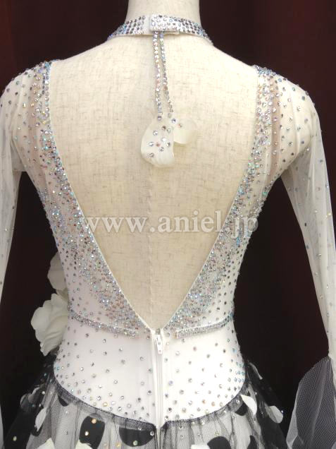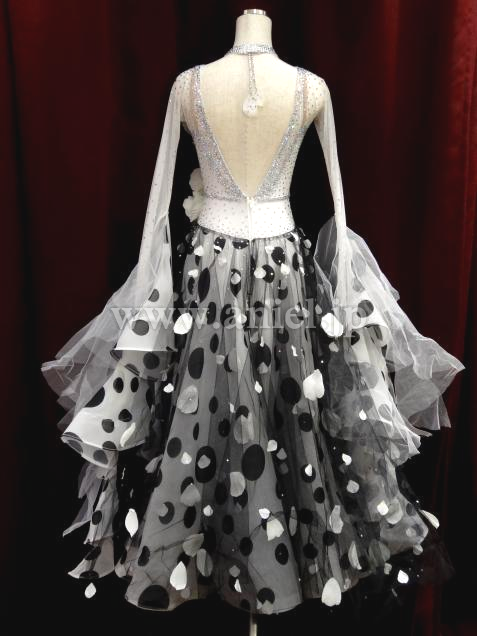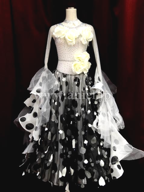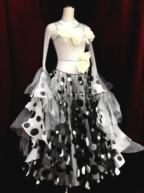 白地に黒の水玉の生地の上には黒チュールに白い花びらが装飾されており大変豪華でボリュームもあります。