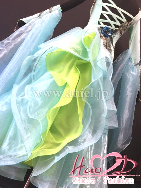 ★四枚目-----柔らかい蛍光緑のジョーゼット生地を使用、裾の内側にホースヘアを入れて表面SKを支える;
