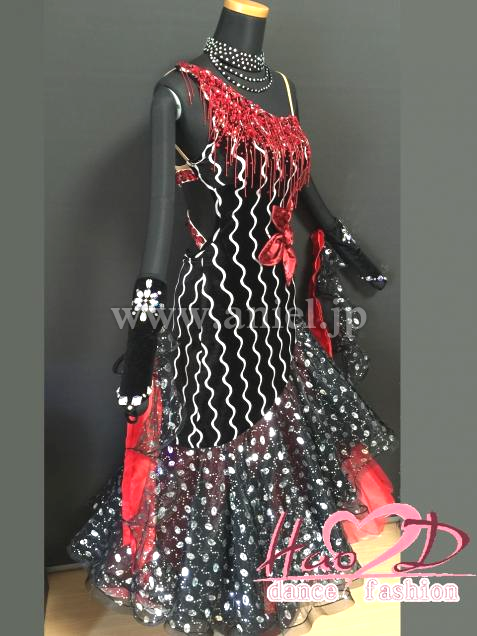 メリハリのある黒、白、赤三色使い、ウエーブと水玉のユニークなMIX柄で良く目立つモダンドレス。