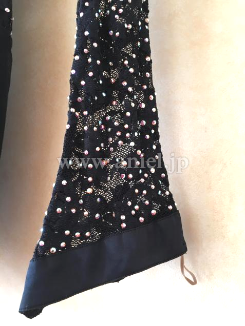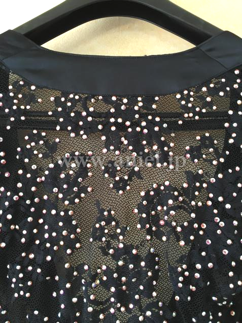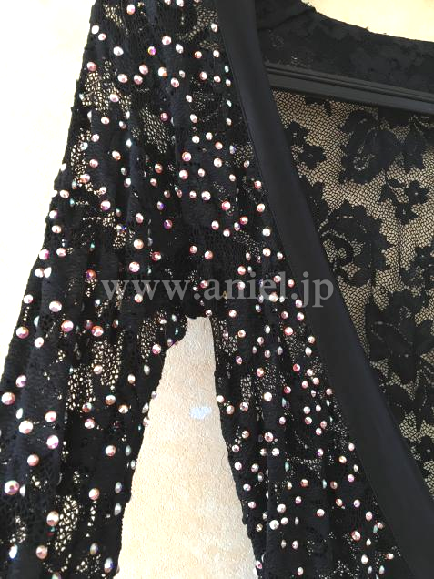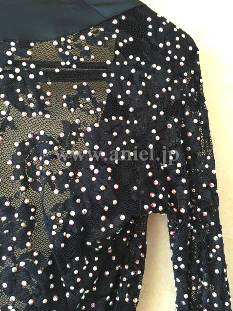 シースルーレースの生地の上にスワロフスキーの石が全体にたくさんついています。エレガントで品があり、ボディにフィットするデザインで、状態は非常に良くきれいです!