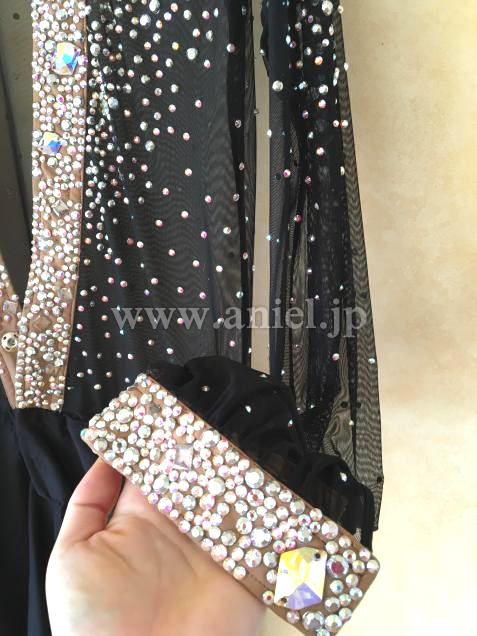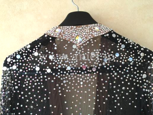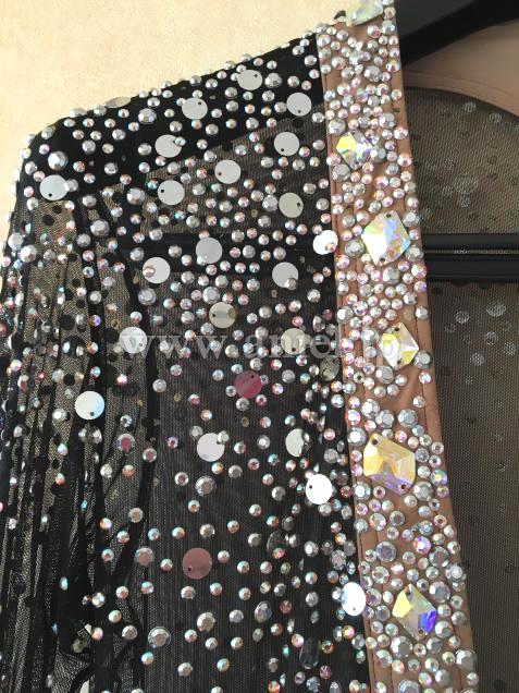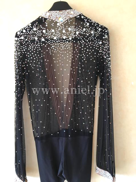 きめ細かいメッシュ生地にスパンコールと大きめの石が大量にちりばめられた、とても煌びやかでゴージャスな衣装です!!やや石取れがございますが、フロアではかなり輝いて目立つのでオススメです!!