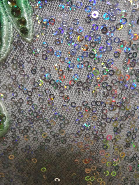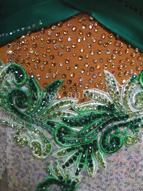 スパンコール生地のスカートはキラキラ光ります。モチーフレースにはスワロフスキーストーンがびっしり貼られゴージャスです。