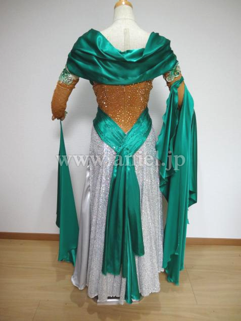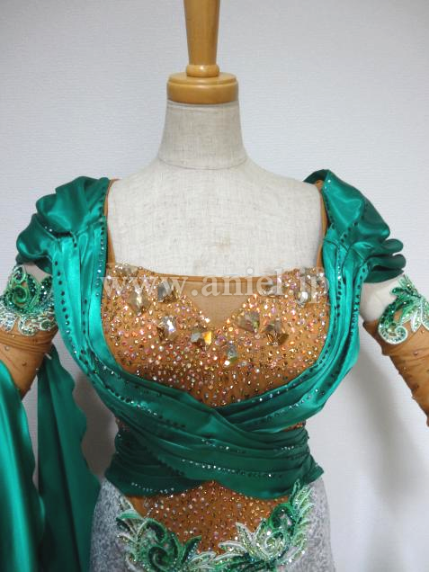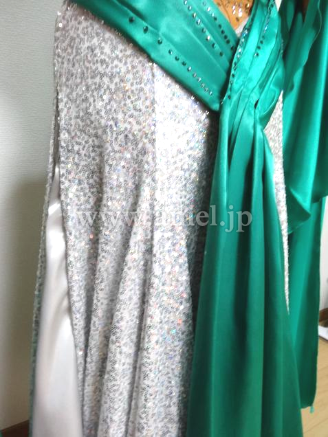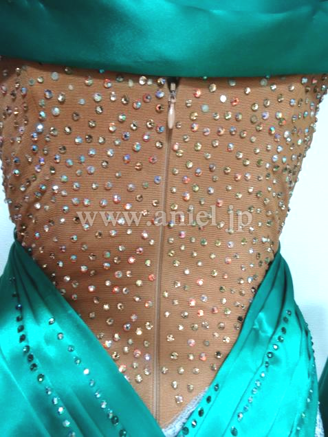 光沢のあるジェードの生地がインパクトあるドレス。