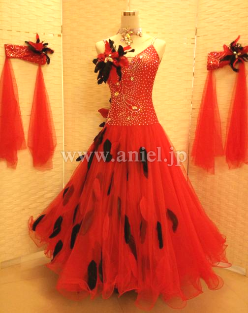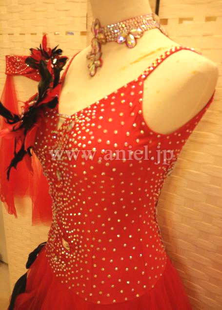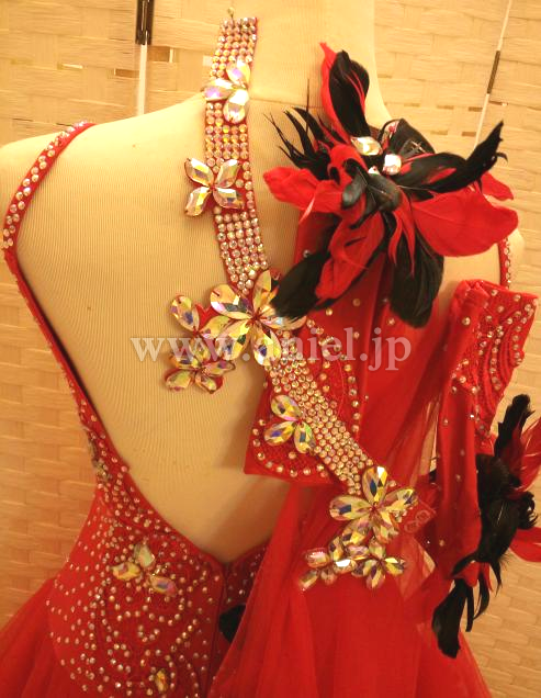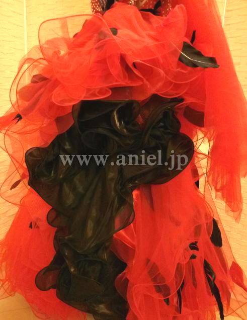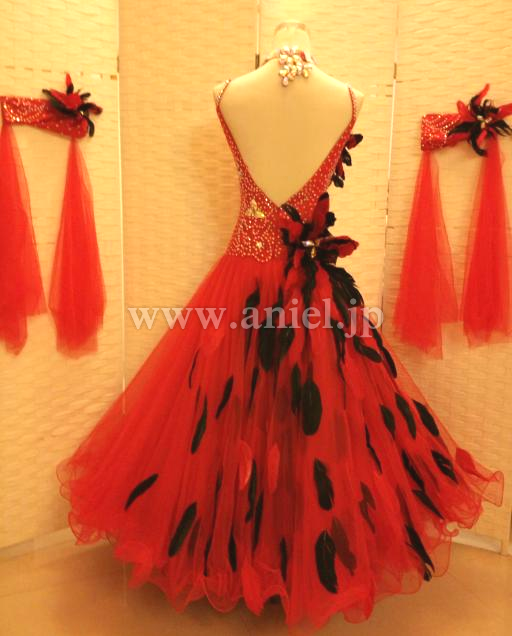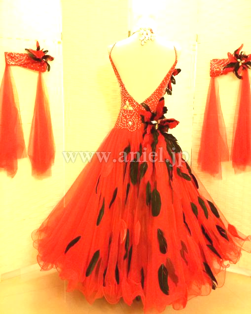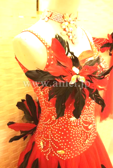 赤のドレスに黒の羽根が散らされた強いイメージのドレスです。