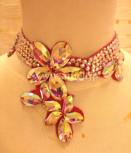 胸元には羽根で大きな花がデザインされており、ボディはたくさんのチェコ製ストーンで装飾されています。