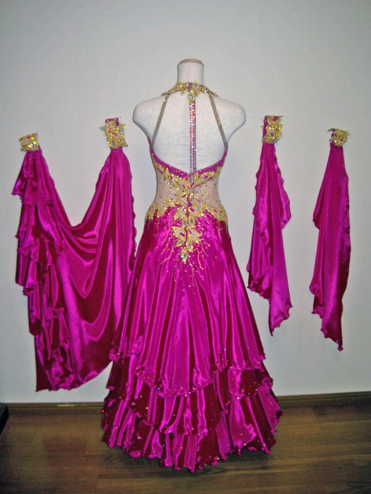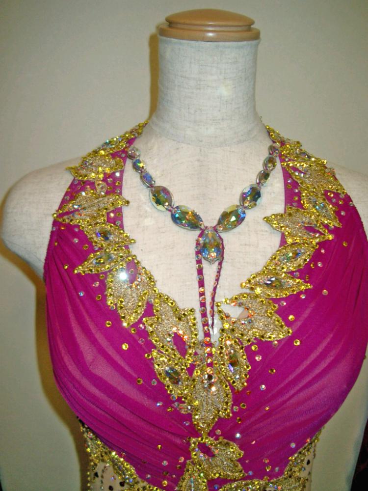 ピンク紫の布地にゴールドのモチーフが美しいドレスです。フロートにはクリスアンのサテン生地使用。スカート内側(外からは全く見えない場所)にヒールで踏んだことによる破れあり。付属品あり(髪飾り・イヤリング)