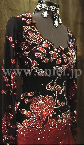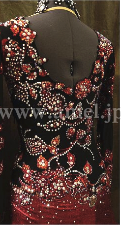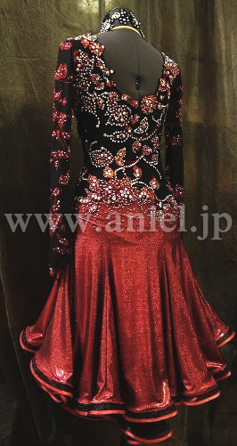 スカートのオーバースカートは赤のフォイルプリントで光沢があり、アンダースカートは黒のオーガンジー。ソフトボーンがつけられて
