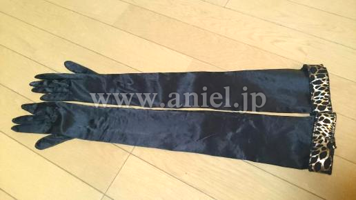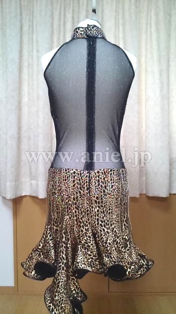光る素材のゴールドと黒のヒョウ柄でオーダーメイドのドレスです。裾のフリルと竹ビーズがよく踊ります。首の部分の三角形の石はスワロフスキー、ボディに貼られているグリーンとオレンジの石はプレシオサを使っています。ボディの透け感がとてもセクシーです。腹部の透けが気になる方もいらっしゃると思うので、黒のバタフライモチーフをお付けします。オーダーイヤリング付きです。