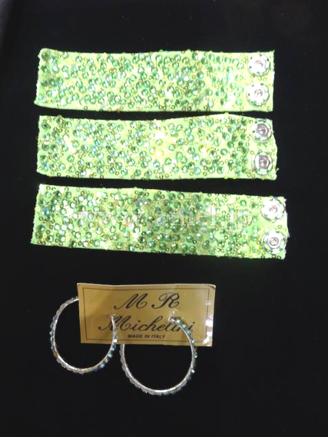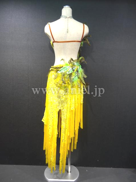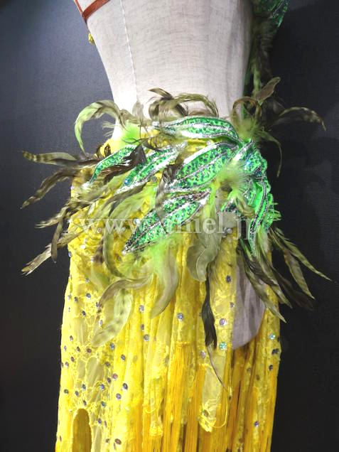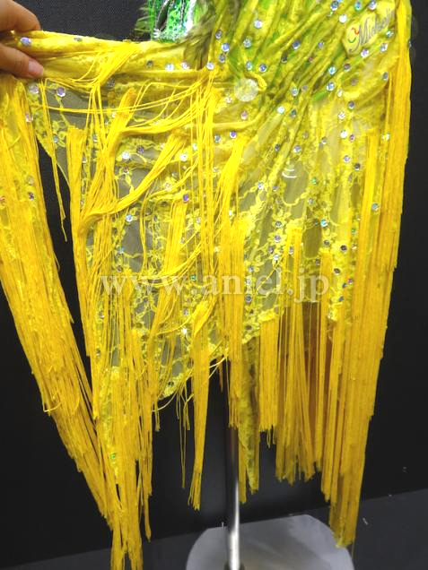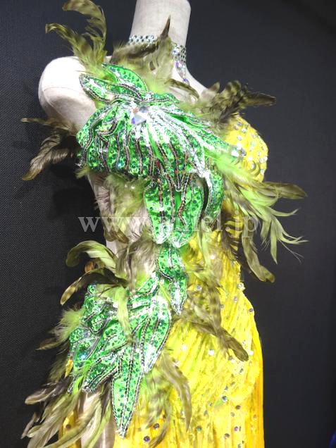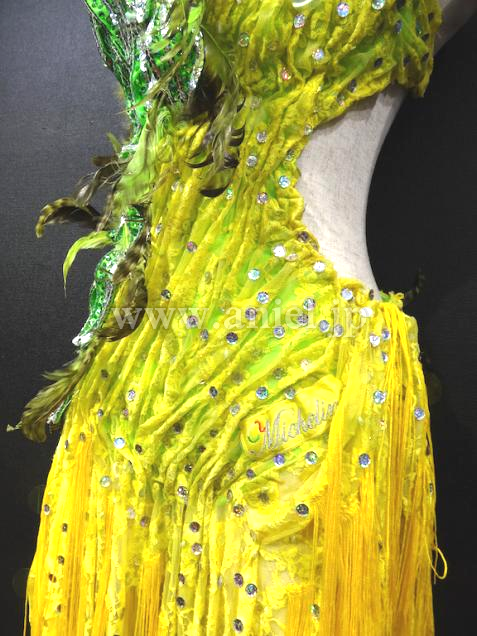 黄色とライムイエローのビタミンカラーの組み合わせ。どのフロアでも目立ちます。ボディとスカートはイタリア製のストレッチレースですが、内側のライムグリーンのレオタードが透けて見える、ちょっとセクシーなドレスです。手作りの葉っぱのモチーフや、縞の入った珍しい羽を使っていて、立体的でとても素敵です。ボディもいギャザリングしていてボディの形にフィットするので、体型をカバーしてくれる効果があります。フリンジもアシンメトリーに縫い付けられていてお洒落です。アクセサリーはネックレスとピアスとバングルです。