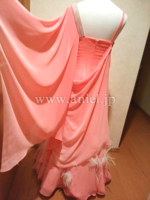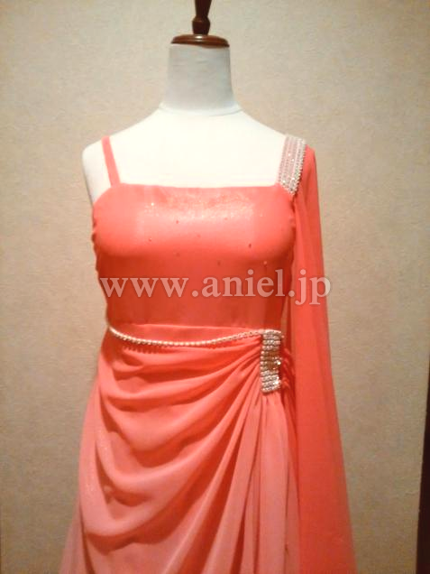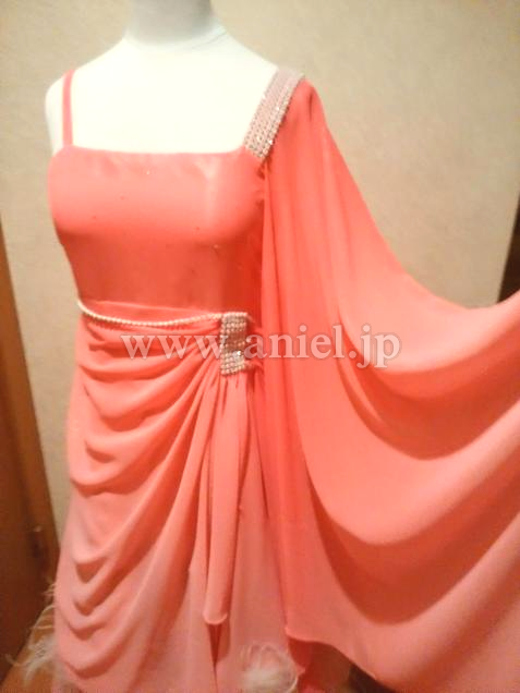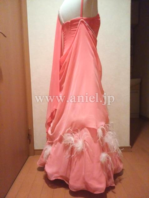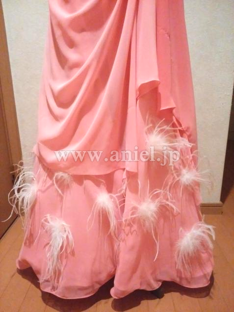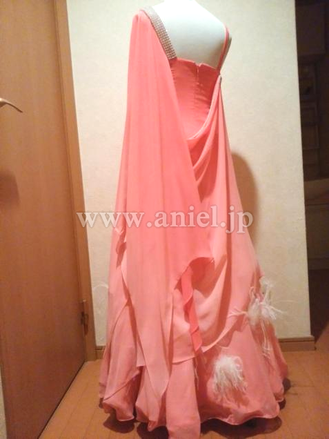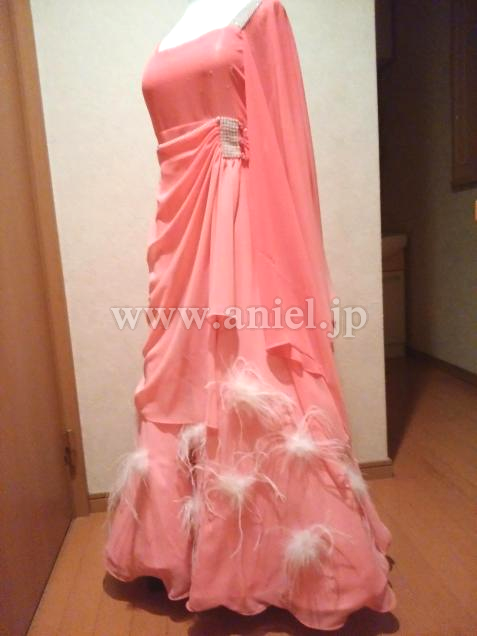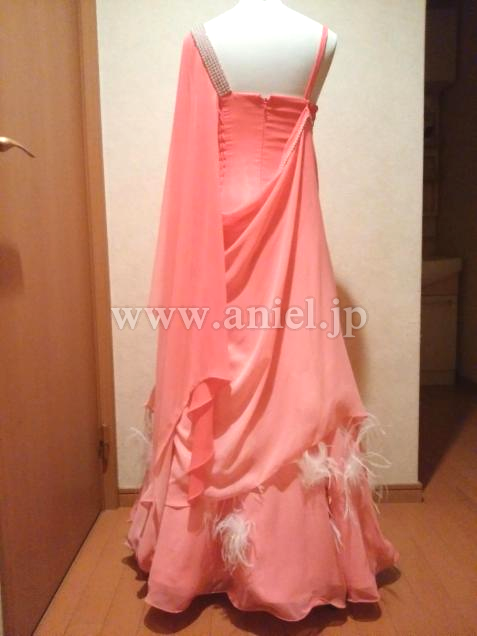 柔らかなピンクのドレスです。大きなドレープが美しく、肩やウエストにワンポイントで飾りがついています。