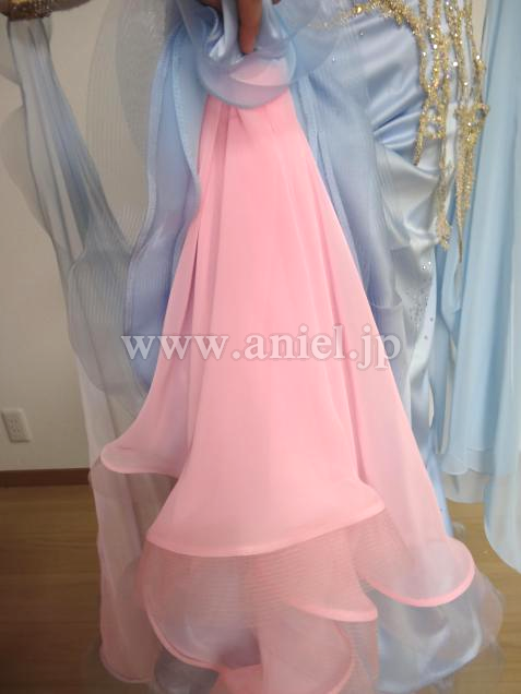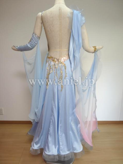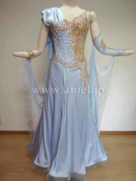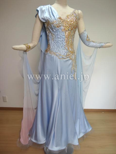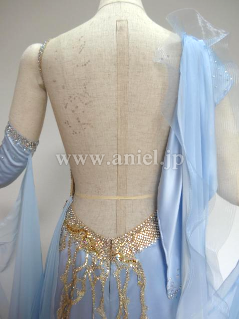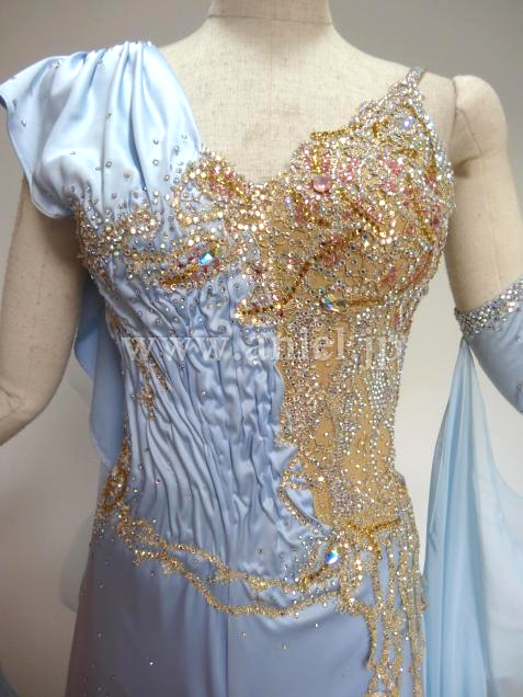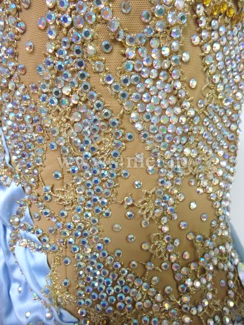 水色とゴールドの組み合わせのドレス。ボディの装飾は細かくゴージャスです。