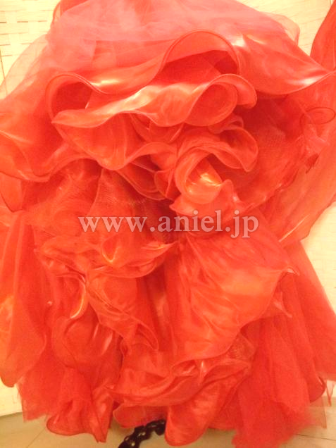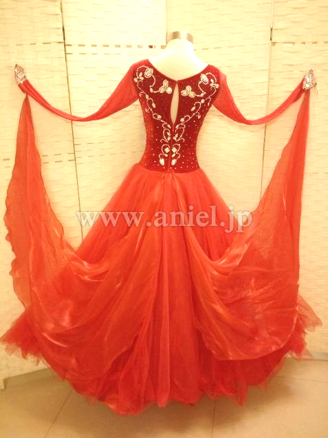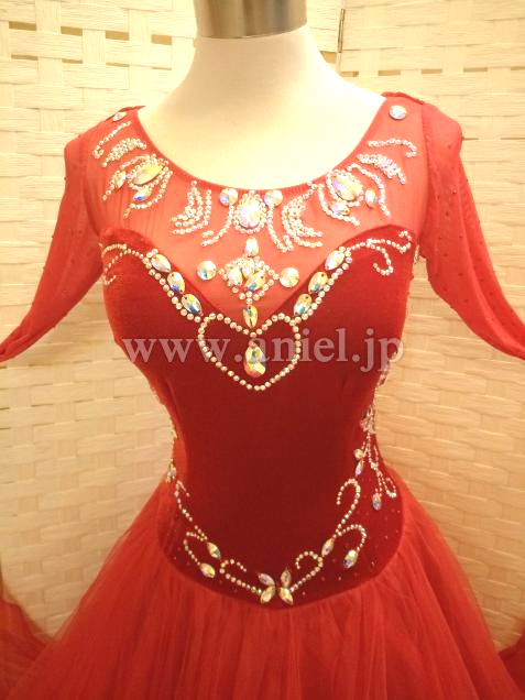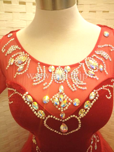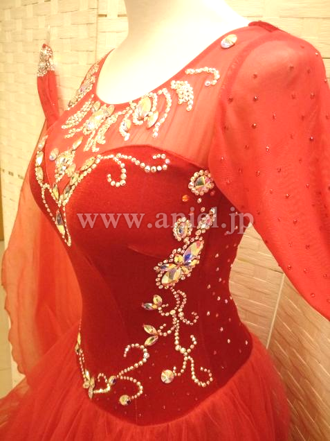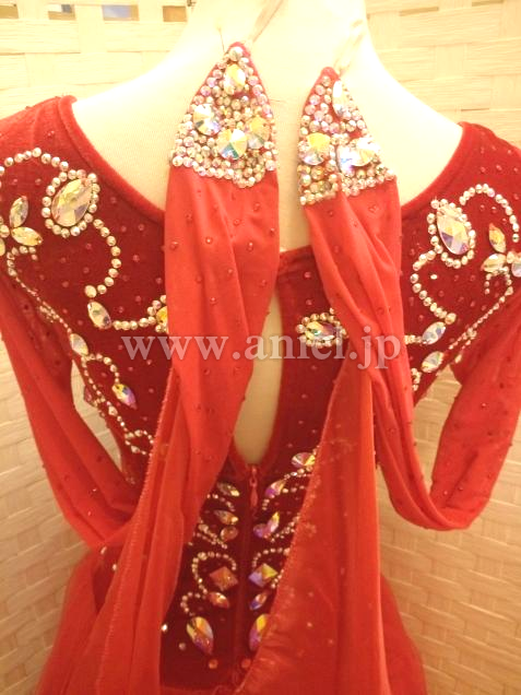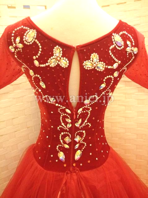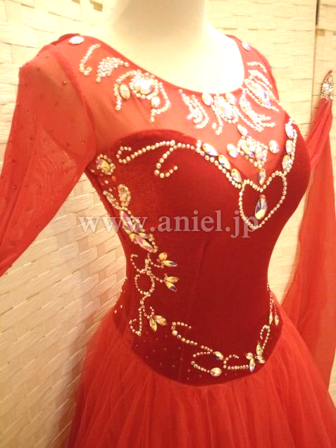 赤のベロアボディにオーロラのスワロフスキーストーンが映えるドレスです。