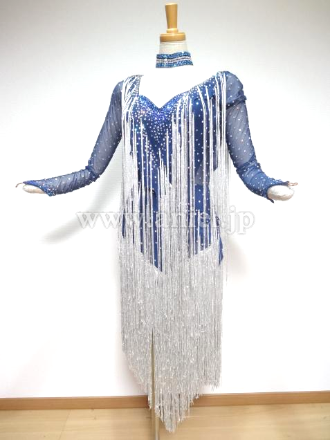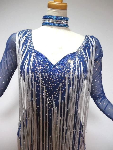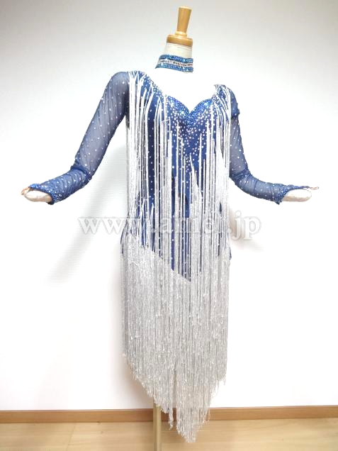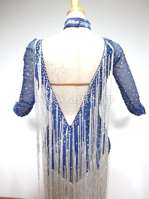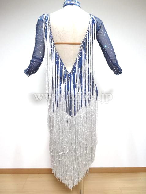 紺に光沢のあるシルバーのフリンジがついているドレス。