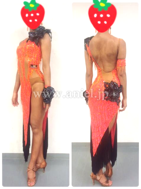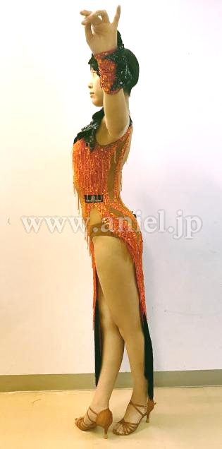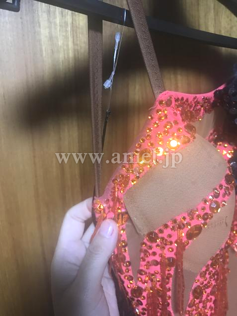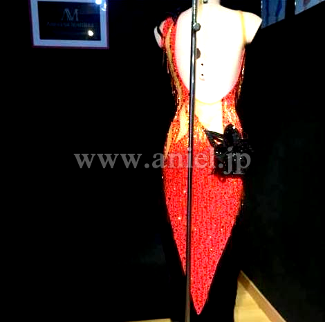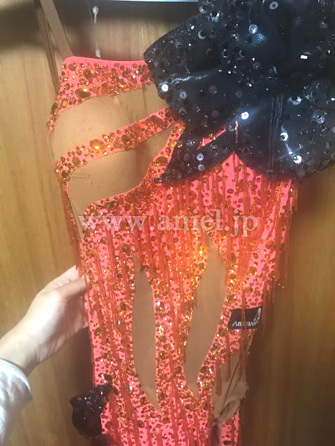 ベースはタンゴフレアで、全体にストーンと竹ビーズのフリンジがついていてとてもよく光ります。