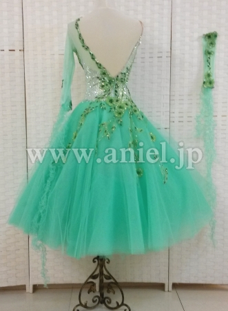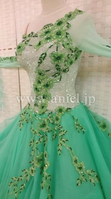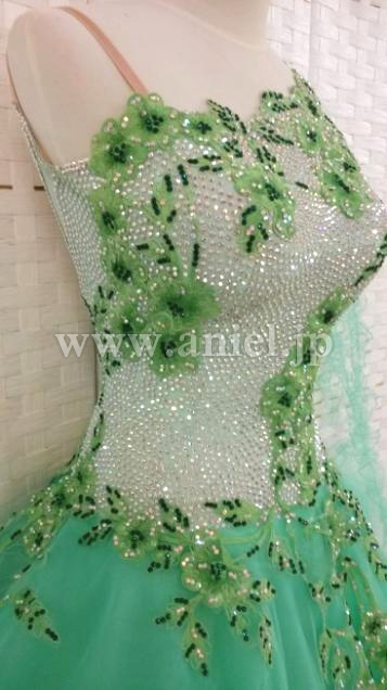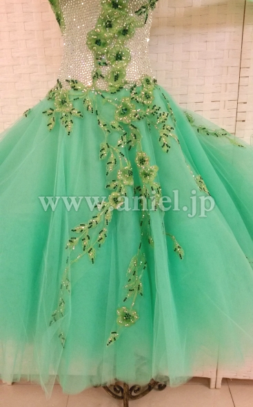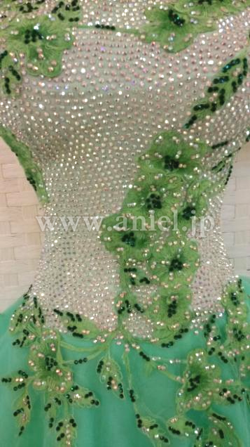 ボディはスワロフスキーストーンがびっちりと貼られたサピエル社の個性が出た非常に豪華なデザインです。胸元からスカートにかけて繊細なレースモチーフがあしらわれています。