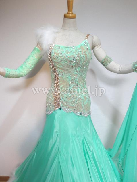 ボディ部分は、レース生地が使用され、パールやストーンで華やかに装飾されています。