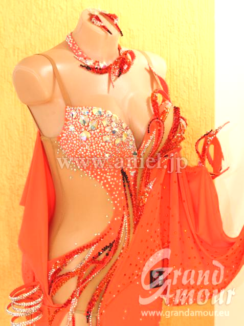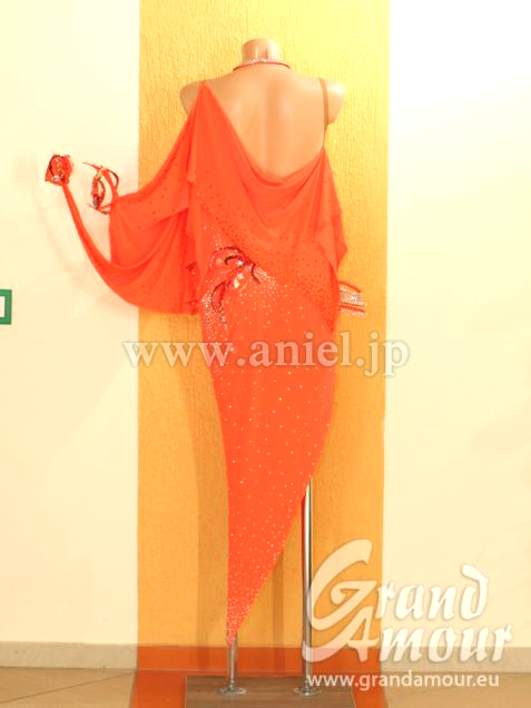 Grand AmourのUKコレクション。女性らしい曲線のよく出た美しいドレスです。クリオネのようなドレープが付いており、動きの幅が出てボディの半分がヌードカラーとなっているため、着用すると半分だけに布が付いているように見えて、とてもセクシーです。ドレープは背中の方にもつながっており、背中の動きもサポートしてくれるデザインとなっています。