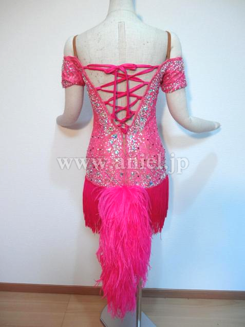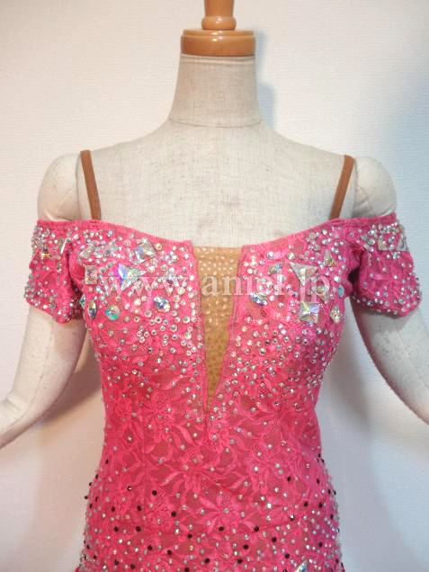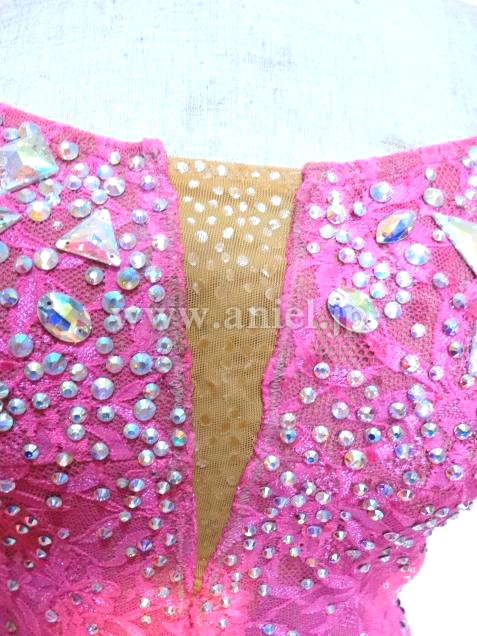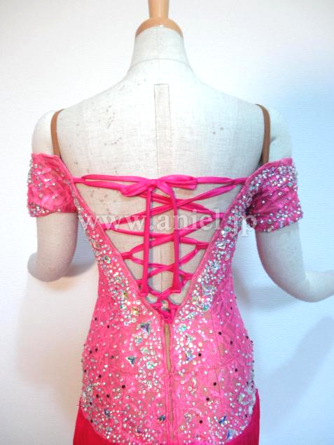背中は編み上げデザインで可愛らしく、レース生地のボディにはたくさんのストーンが散りばめられ華やかです。