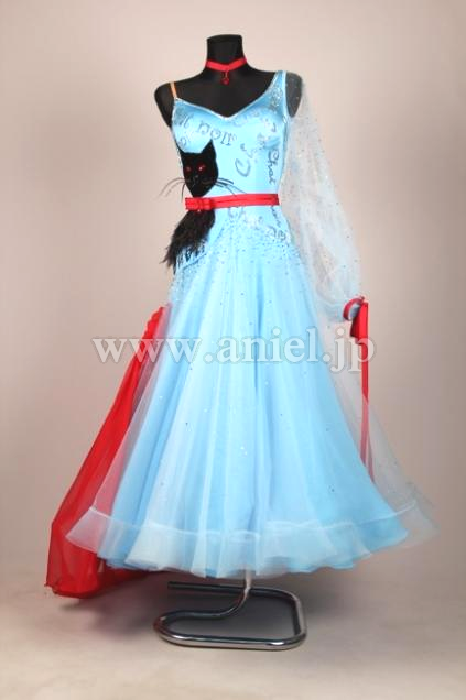 水色のボディに黒猫がデザインされているとても個性的でキュートなドレスです。