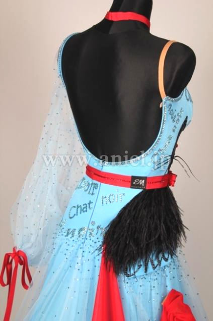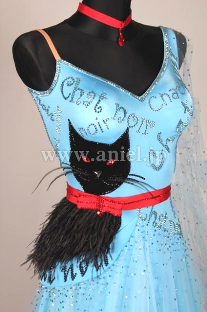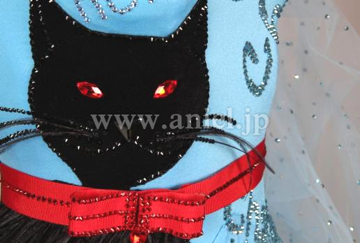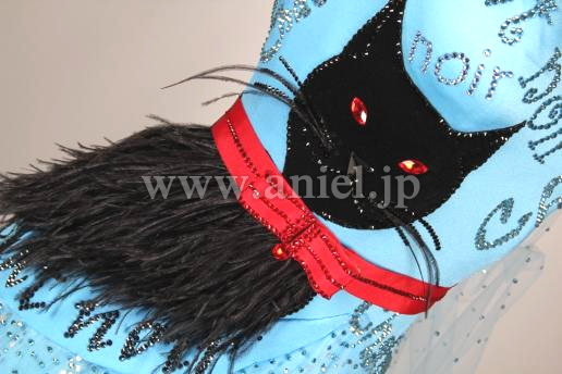 ボディの右サイドに黒猫の顔が描かれ首輪の赤いリボンがそのままウエストベルトに繋がっています。猫のボディ部分には羽根が使われています。