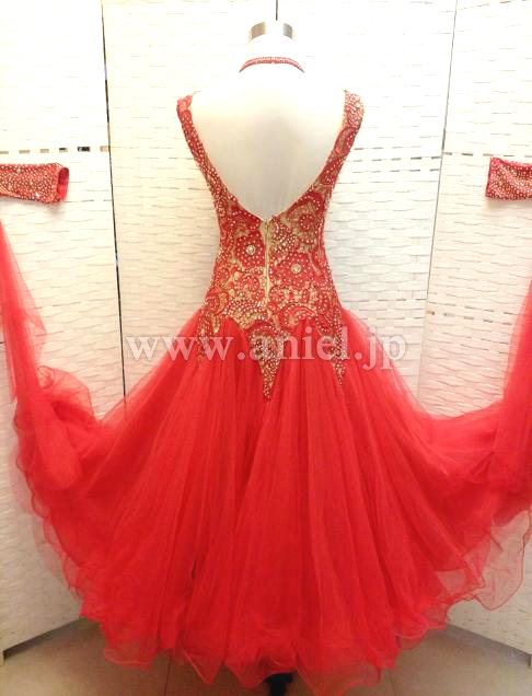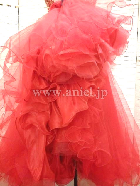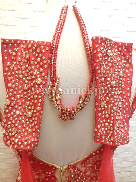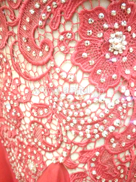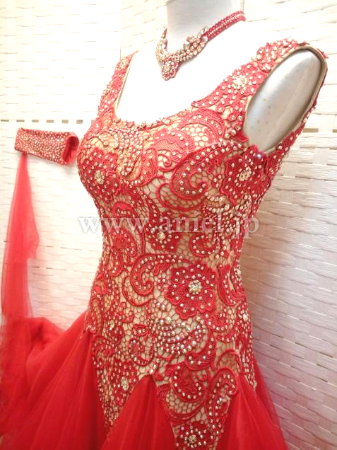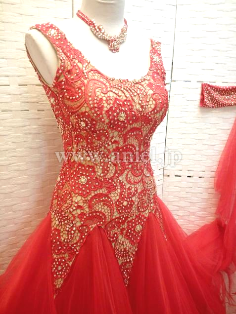 ベージュベースのボディに赤のレース生地が重ねられたエレガントなデザインのドレスです。