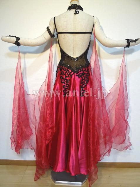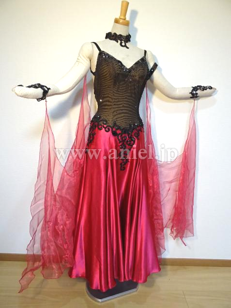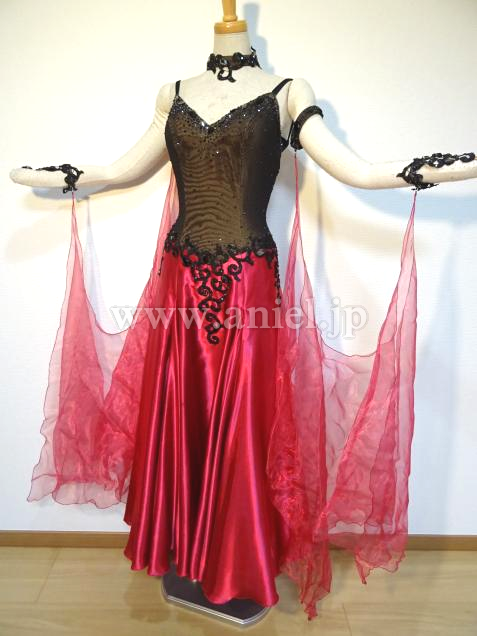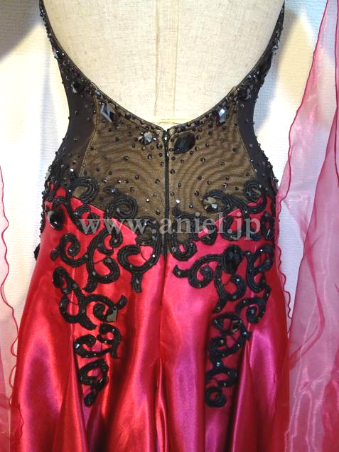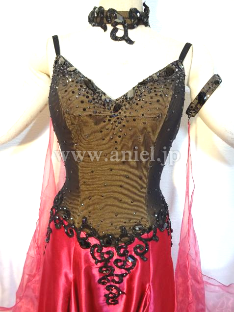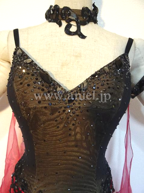 黒のメッシュ素材が重ねられたボディにはモチーフレースが装飾されており、スワロフスキーストーンが散りばめられています。