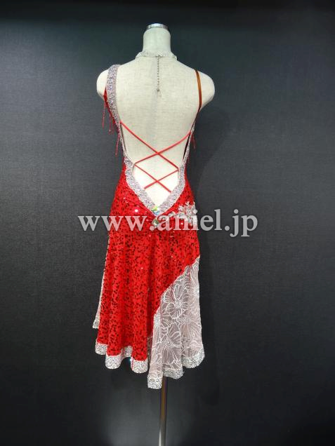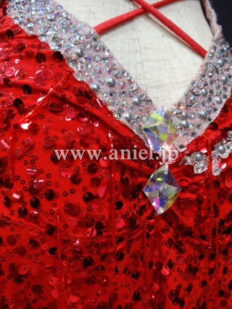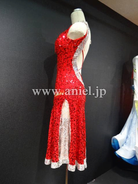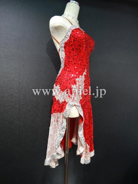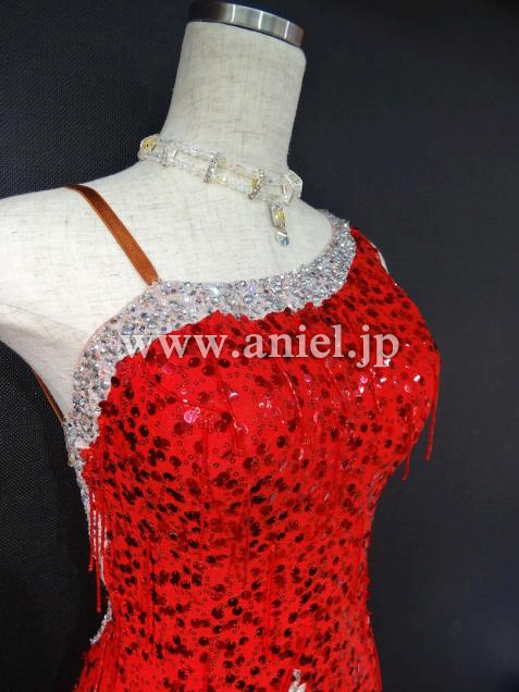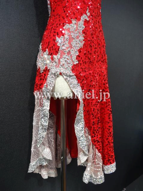 赤のスパンコール生地にワンショルダーのオーソドックスなワンピース型。背中ががっつり開いたフレッシュなドレスです。スカートは右側が露出して、左側はシースルーの生地になっていて、スカート自体は膝丈ですが脚がよく見えてセクシーです。ワンショルダー型なので、胸元の露出も気になりません。全体がスパン生地なので、とてもよく光ります。付属品はネックレス、ピアス、バングルです。