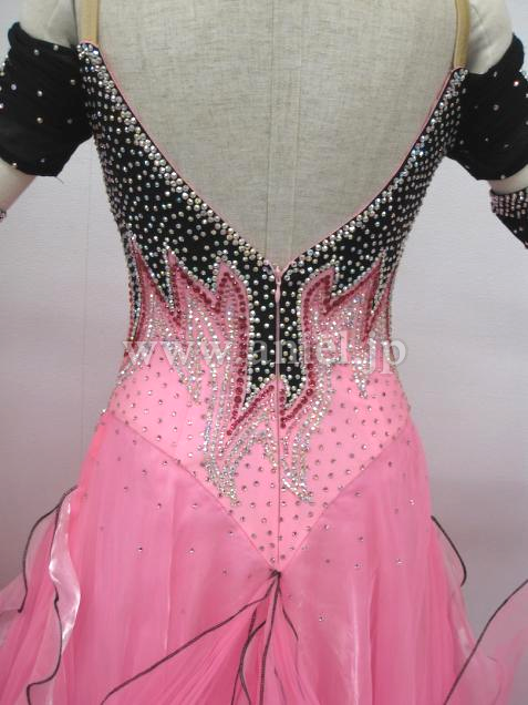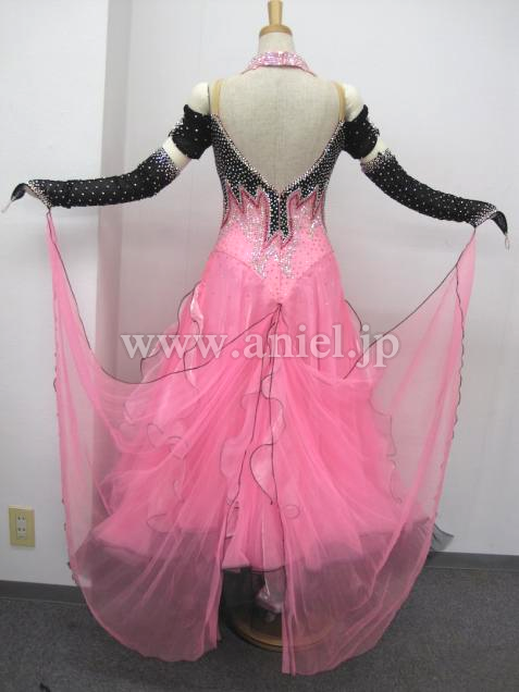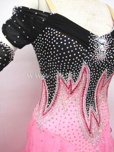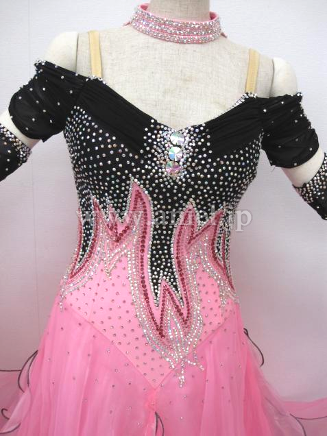 黒のボディにピンクのスカートが可愛いドレスです。切り替えが上の方にあるので背が高く、足が長く見えます。オフショルダーデザインの袖が可愛らしいです。