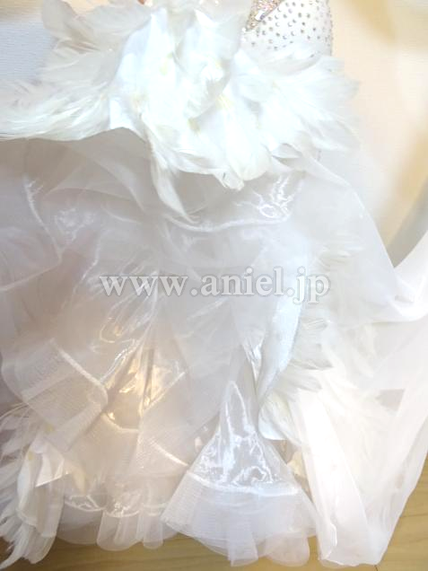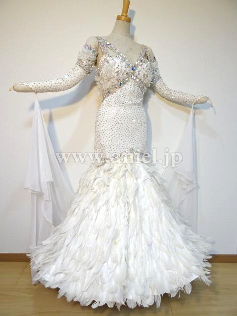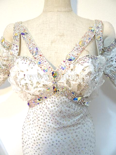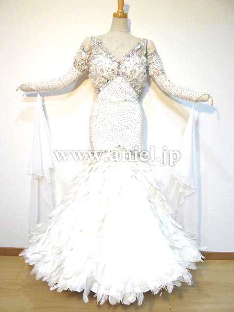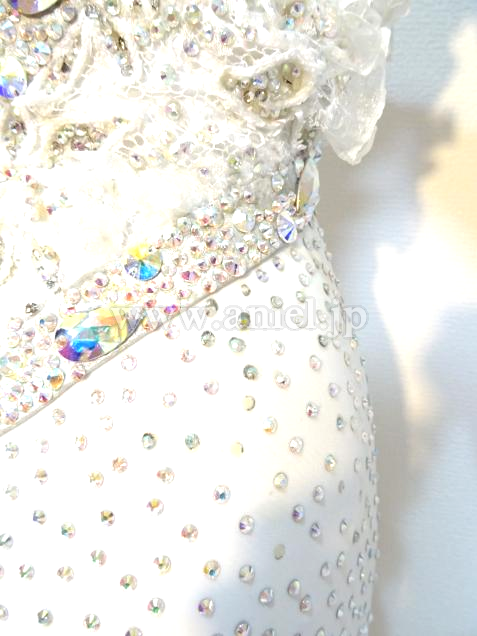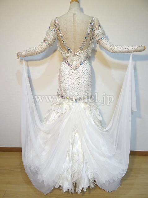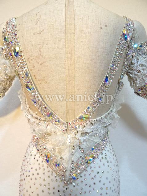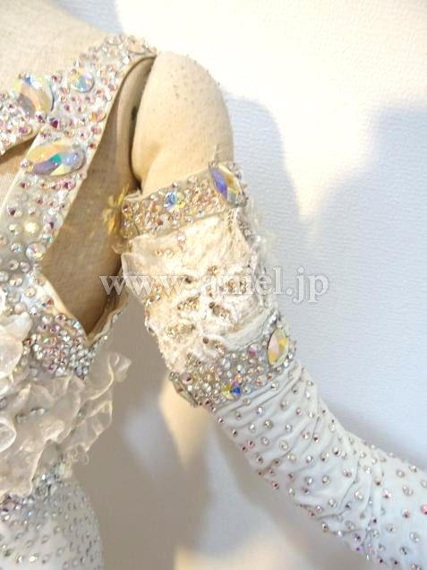 元WDCファイナリストのヤンチャオ組のパートナー、タン・イーリン着用のドレスです。トッププロのドレスを手掛けるイギリスのElaine Gornall製作で、さすがにトップ選手のドレスだけあって、石の数は半端なく、グローブだけでもかなりの重さがあります。真っ白の羽をふんだんに使った大変ゴージャスなドレスです。