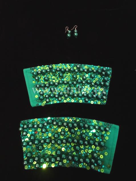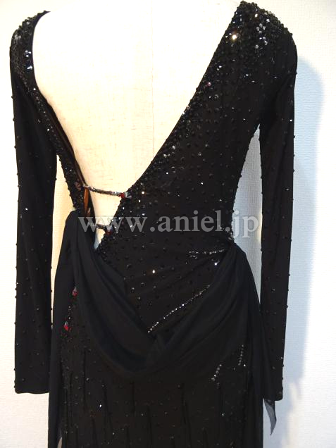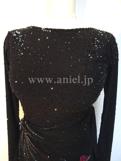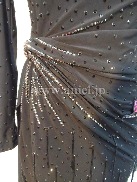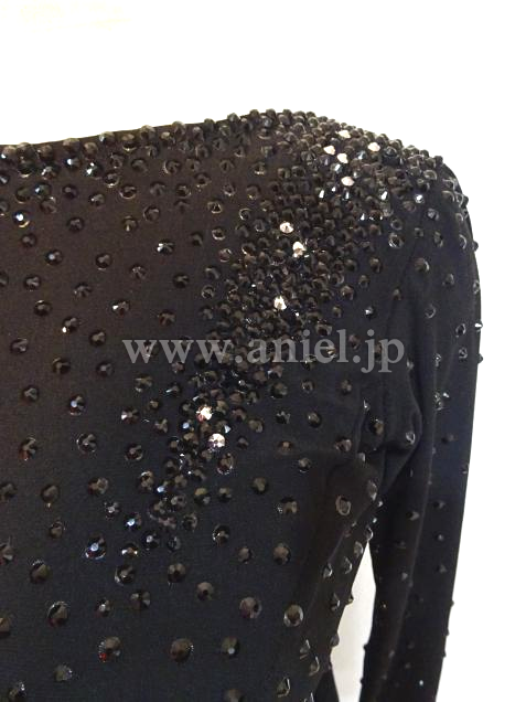 全身黒のスワロフスキーストーンと竹ビーズが大量に飾られ光が当たると輝きます。