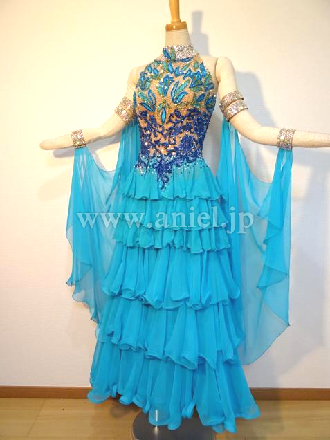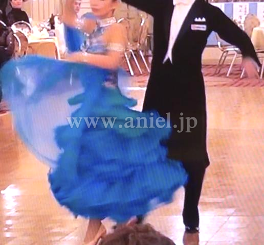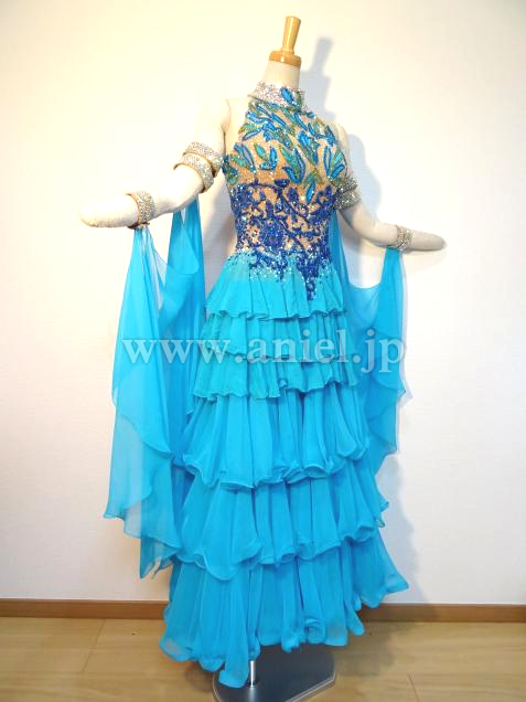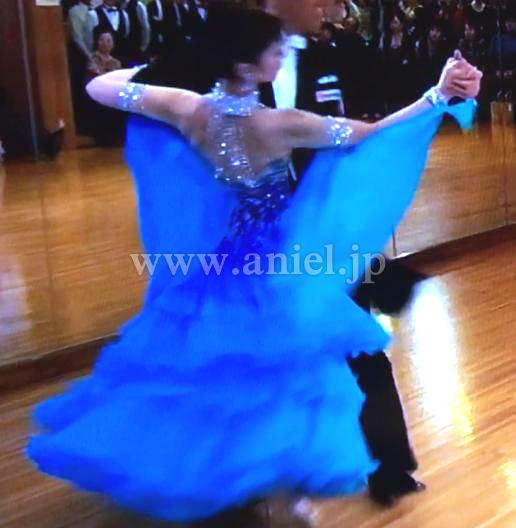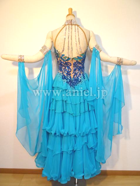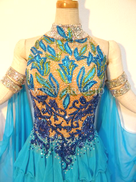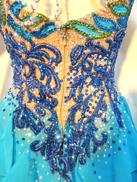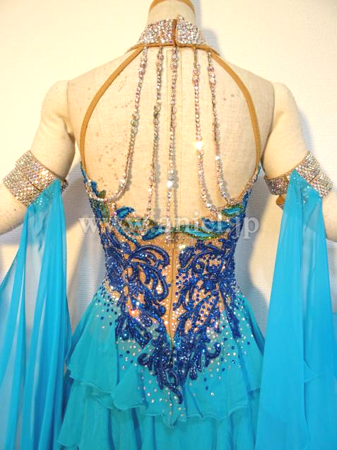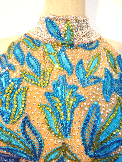 ボディにはモチーフレースの上にスワロフスキーストーンがびっしりと貼られ非常に豪華です。背中のストーンチェーンも踊ると動き、よく輝きます。