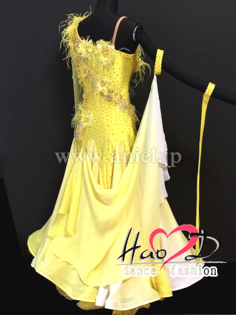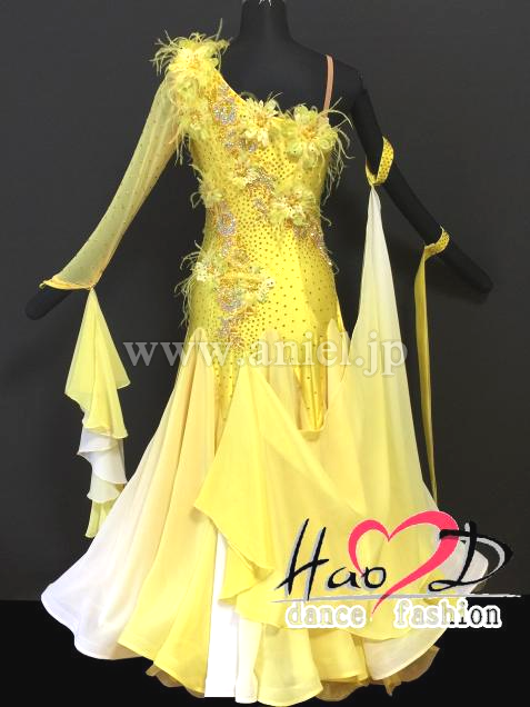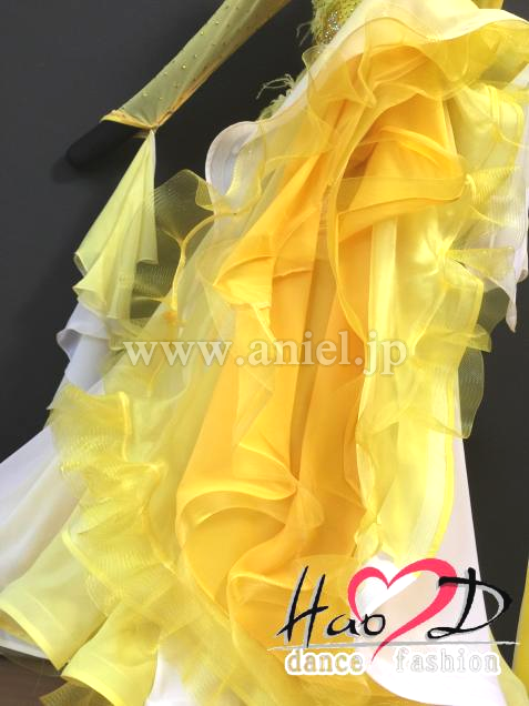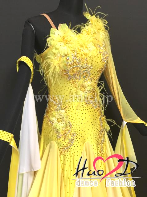 春らしい爽やかなイメージ、黄&白グラデーションカラーに、花弁&羽を飾った豪華なモダンドレス