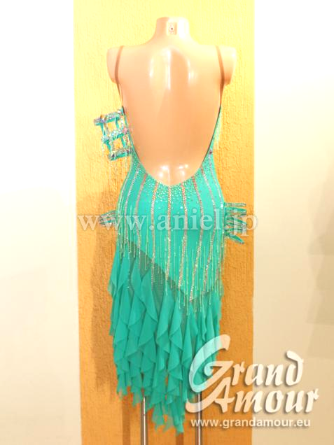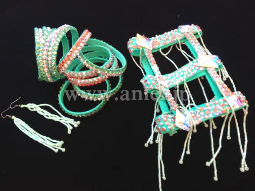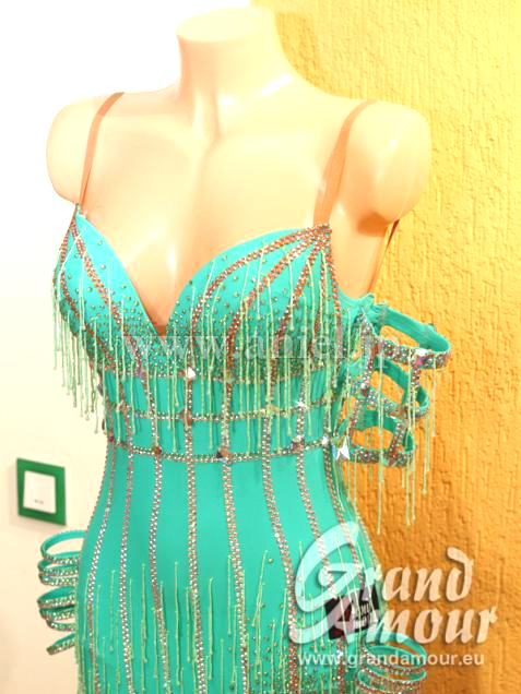 シンプルラインですが縦に流れるシャープな印象です。大粒のスワロフスキーがよく輝き、発色の良さも目立ちます。MLサイズで少しゆとりを持って着ることが出来ると思います。アクセサリーはピアス・輪っか10本・バングル(大)1つです。
