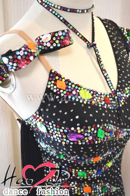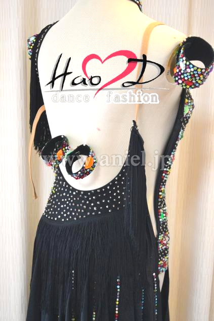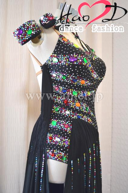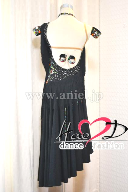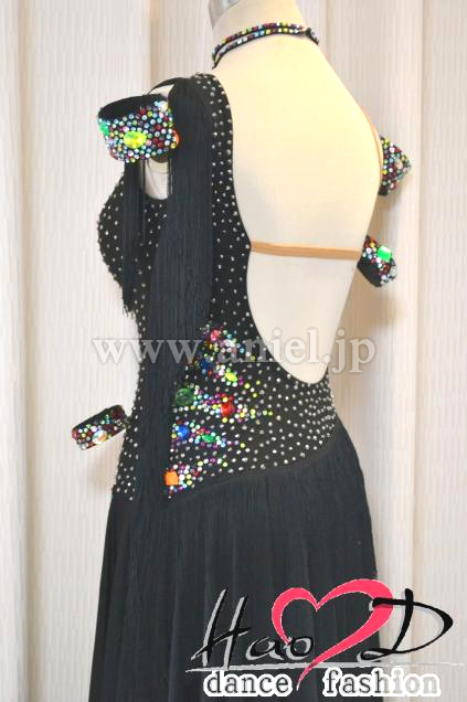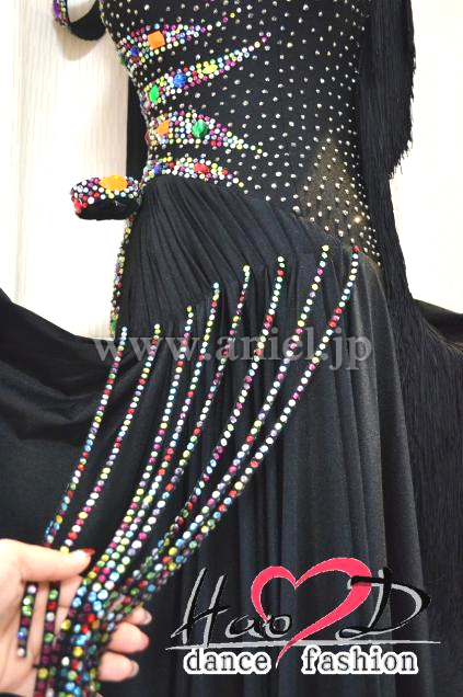 黒いベースに明るいカラフルな石をあしらったパソやルンバにピッタリなロングドレス;