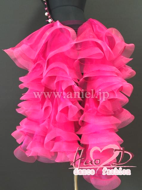 フィットする斜めカッティングのデザインに対し、片側はピンクの大ぶりフリル、オーガンディ生地にホースヘアを付け、とにかく良く跳ね踊る