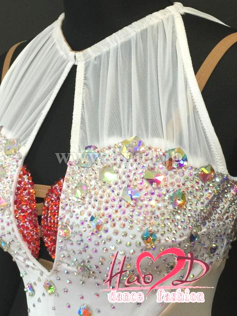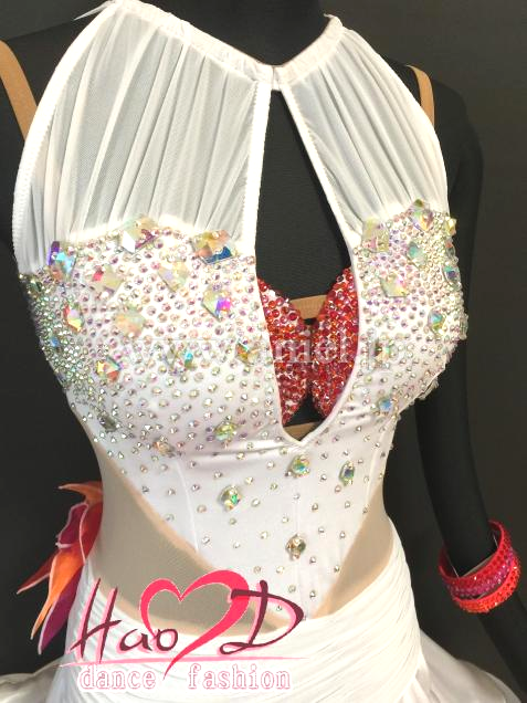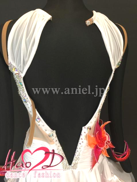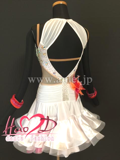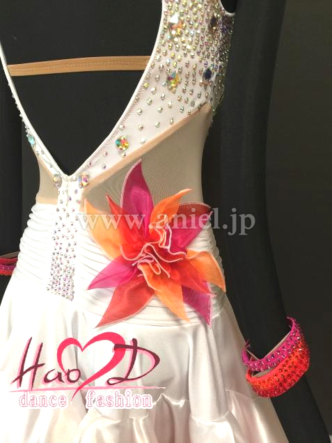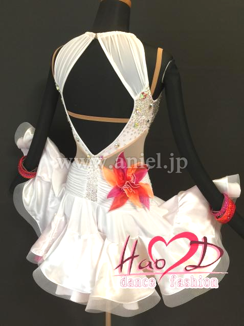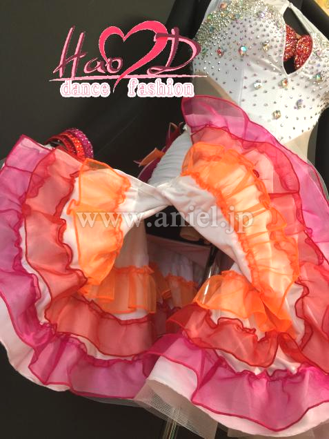 白にカラフルなフリルを取り入れた可愛いフレアーSKのラテンドレス