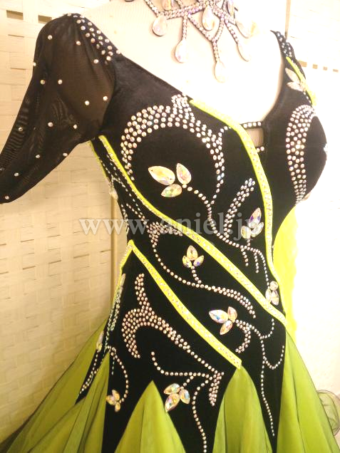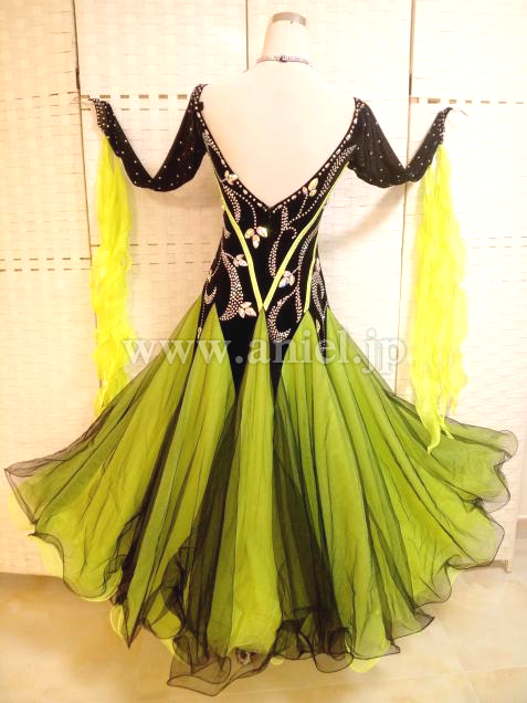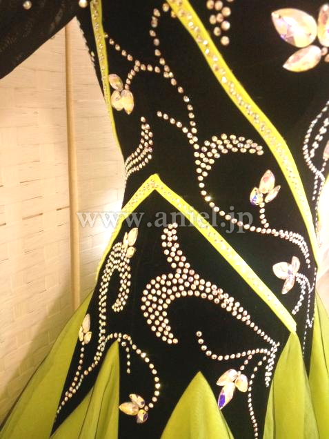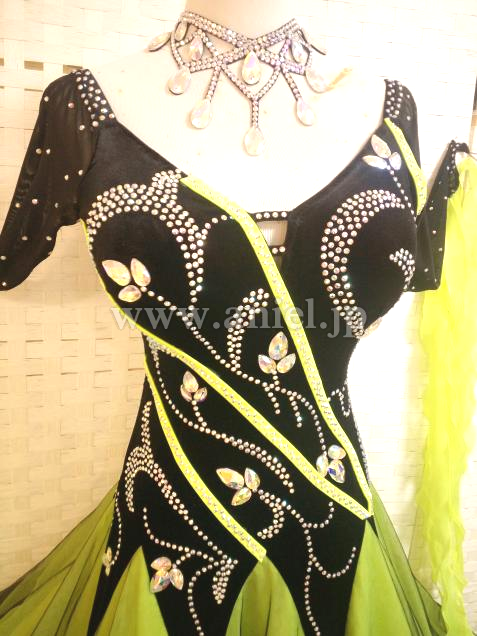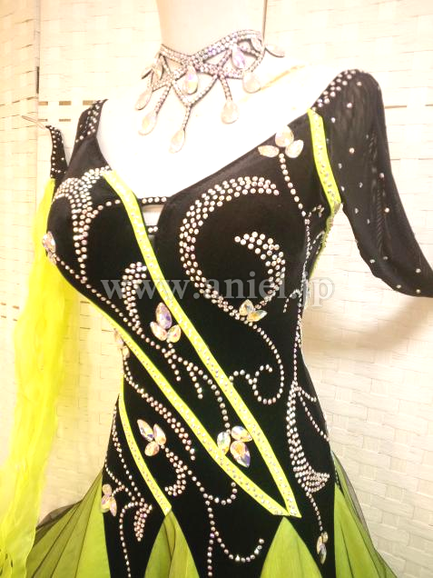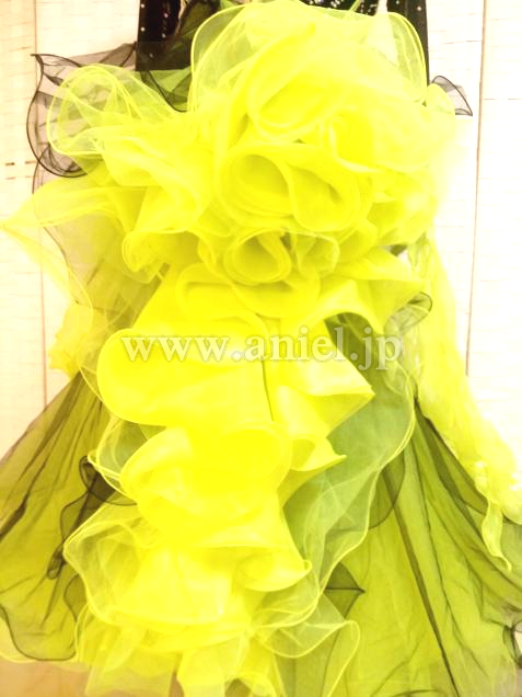 シックな黒のボディに鮮やかな黄緑が映えるドレスです。