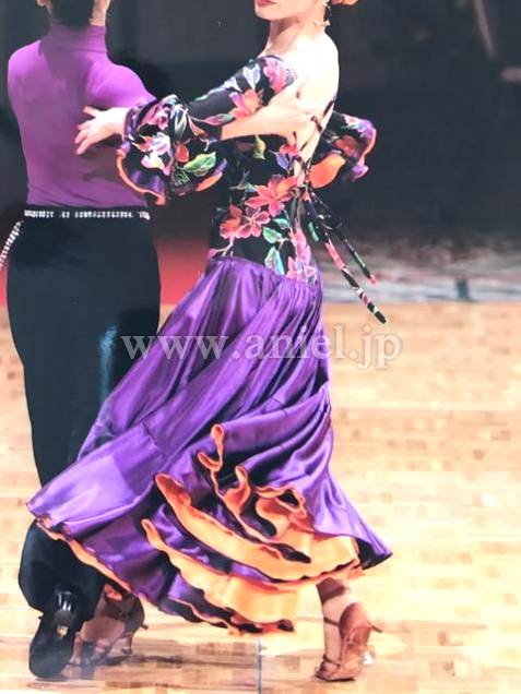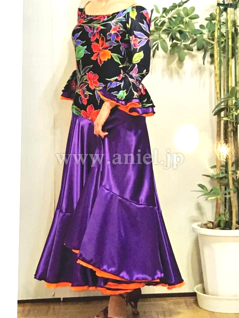 スカートは軽いサテンクレープで、フリルは2枚重ねで内側の蛍光オレンジが大きな動きを出します。