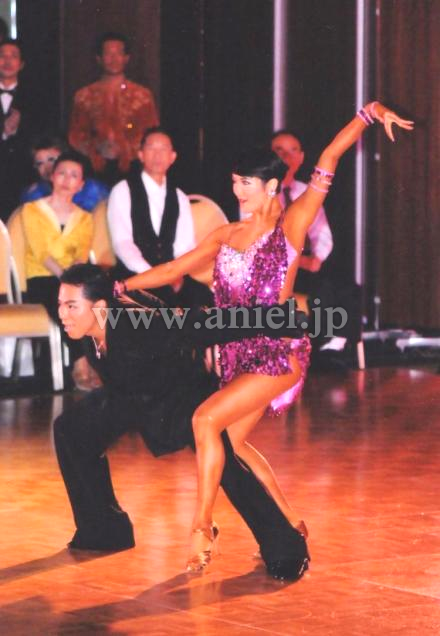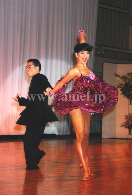 とってもキュートでかわいいドレス!しかも軽くて踊りやすいです。ピンクのスパンコール生地をたっぷり使っていて、胸元はスワロのストーンがびっしり!バルーンスカートになっていてフロアでもドレスがよく動くので目立ちます。