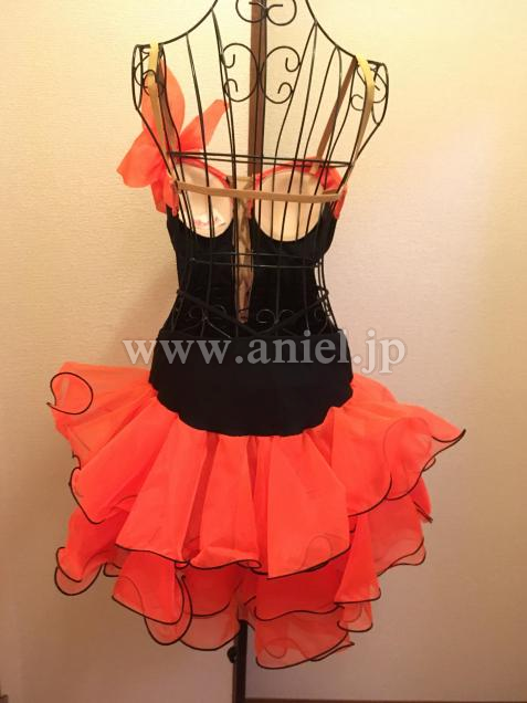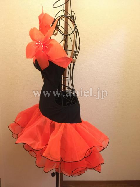 左肩と付属のブレスレットに付けられたオレンジの大きなお花にクリスタルが光り、可憐です。ブレスレットはゴムになっていますのでお好みに寄り、上腕に付けたり、髪飾りにしたり楽しめます。