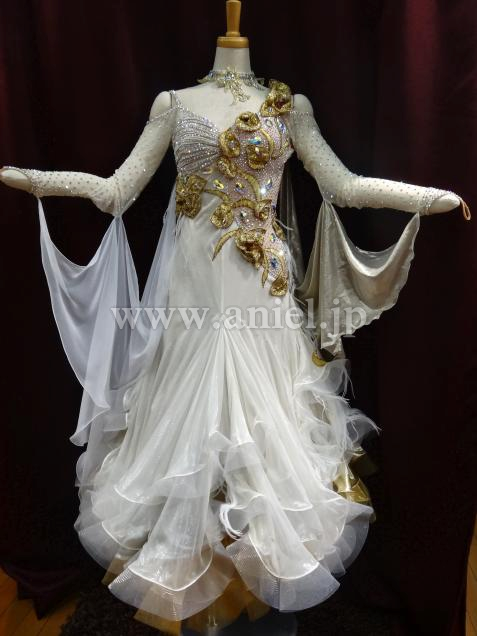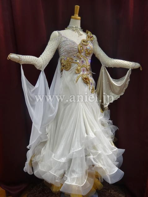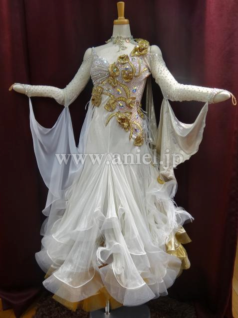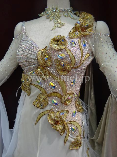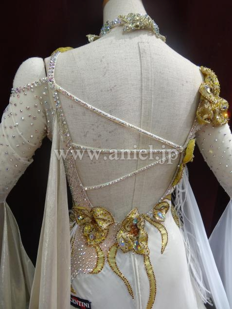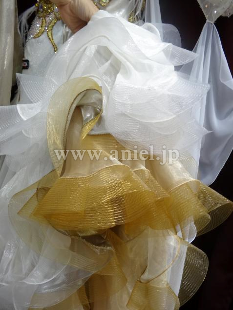 イタリアのオートクチュールの光沢ある生成りとゴールドのシルク地が使われ、表面は光る糸で織られた特殊な生地で、ライトが当たると大変輝きます。