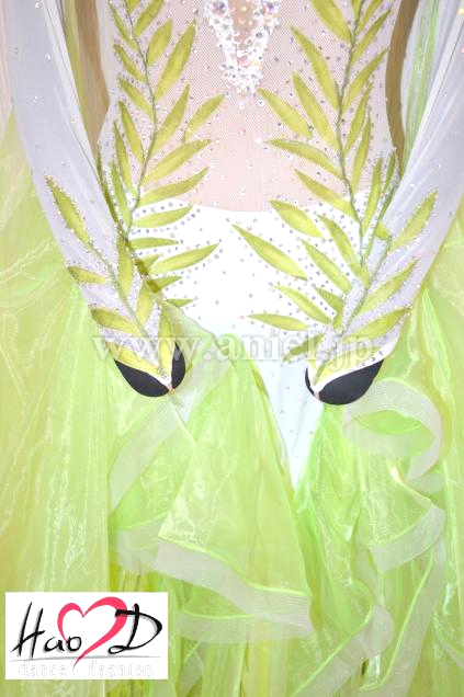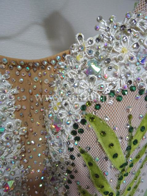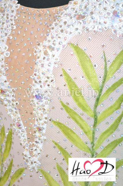 ★ヒップ~上に上るようなイメージで葉っぱ模様のモチーフを施し、縦長効果を最大限に引き出します。こちらの葉っぱ模様はスカート生地を切り抜いて一針一針縫い付けた大変手間かかる作業です;