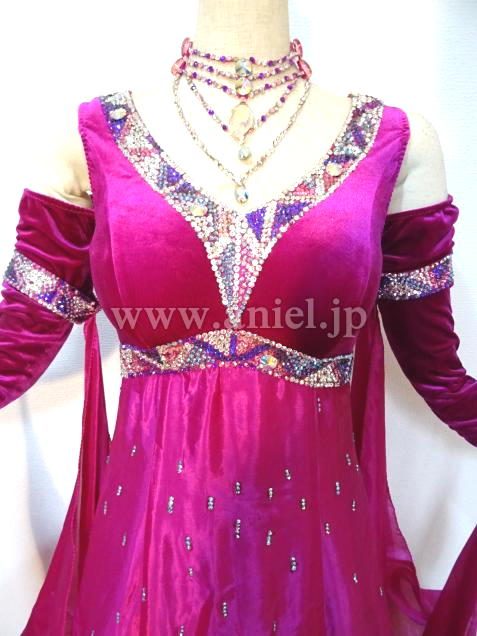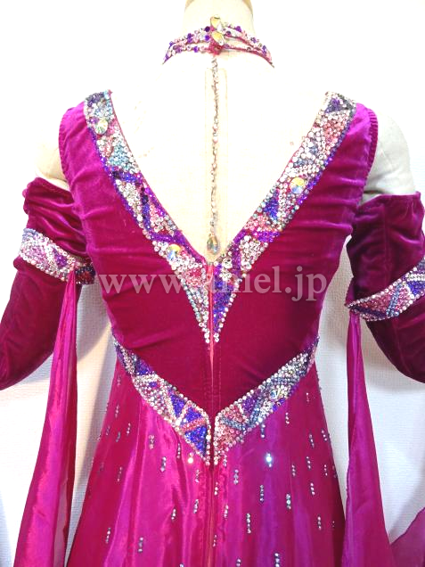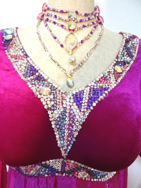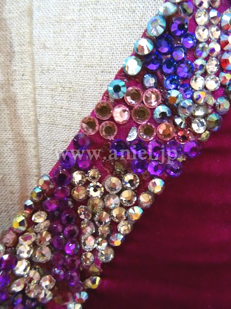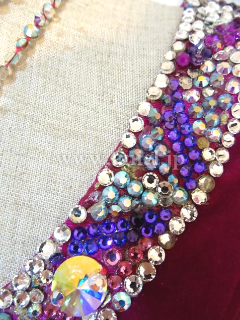 襟元やウエストはスワロフスキーストーンでモザイクデザインがほどこされています。