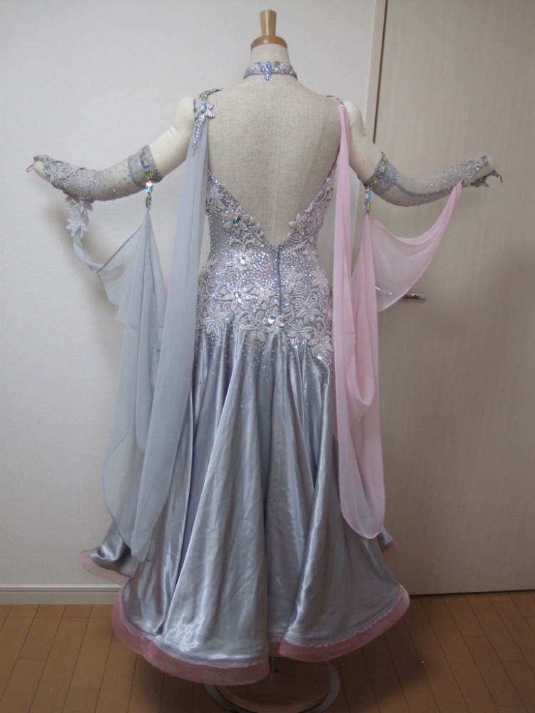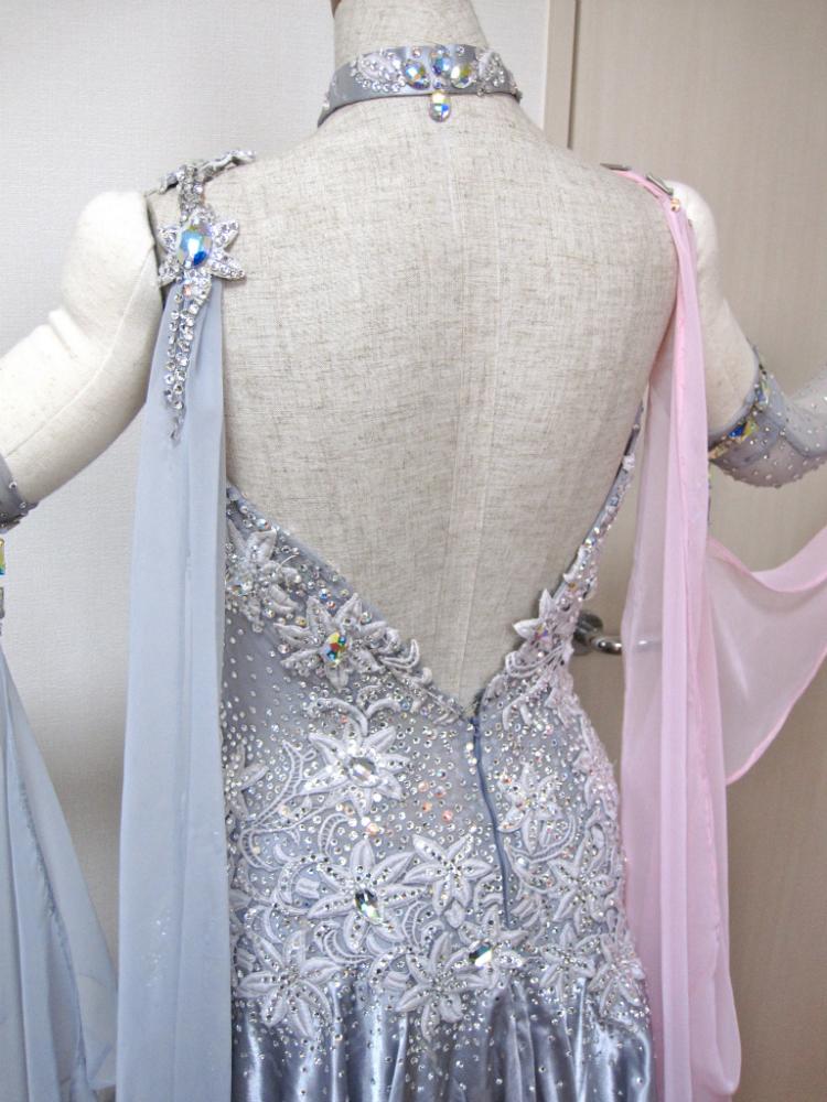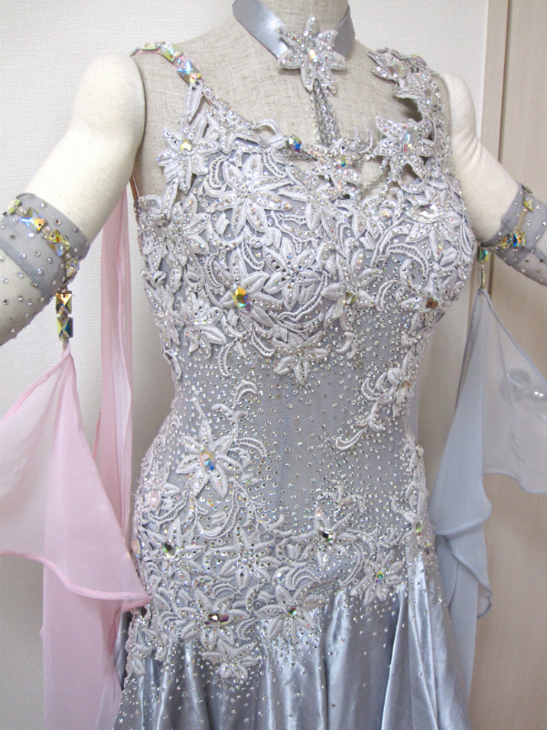 モチーフとラインストーンびっしりのボディに淡いピンクが映えるドレスです。