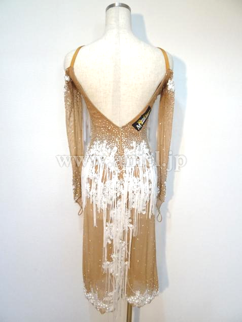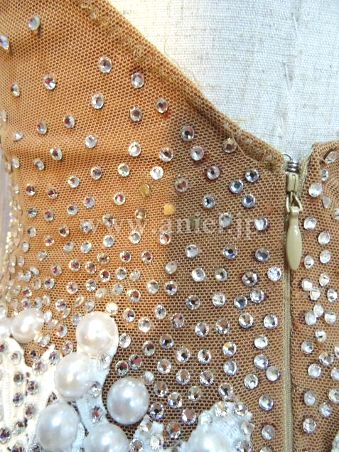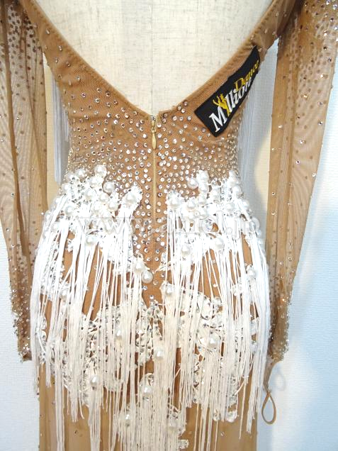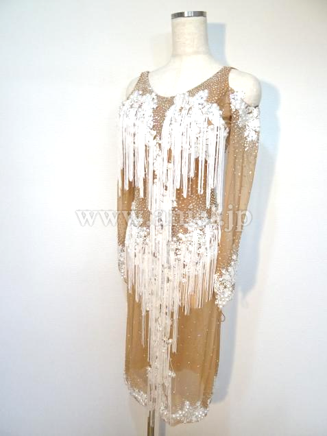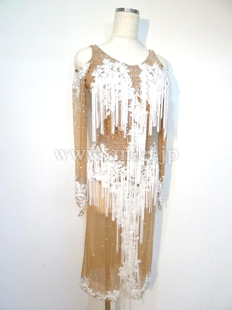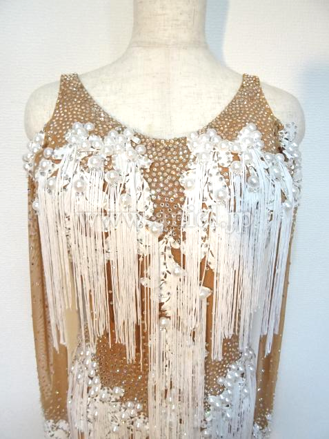 ヌーディなベージュの生地にホワイトのレース生地やパール、フリンジが華やかに装飾されています。