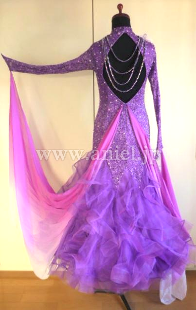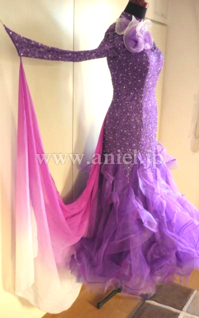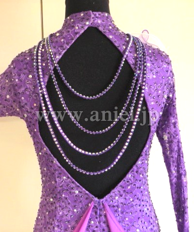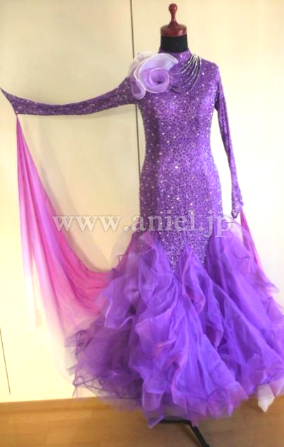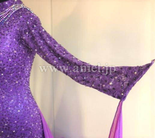 ボディ部分のストーン量も多く、また胸元の白と紫のコサージュと連なったネックレスも、