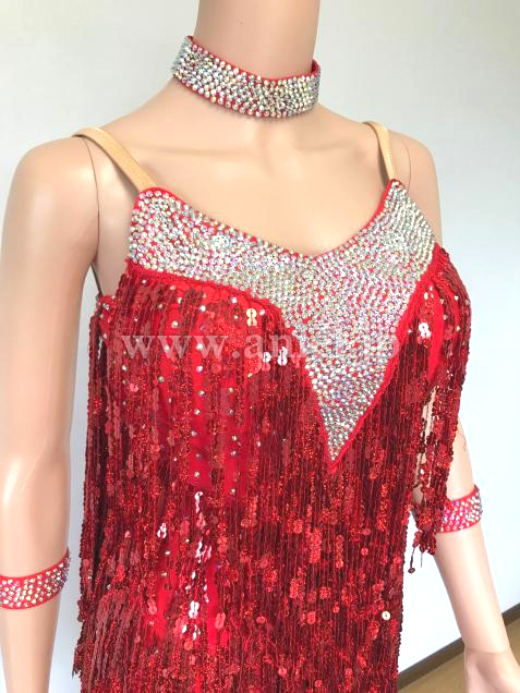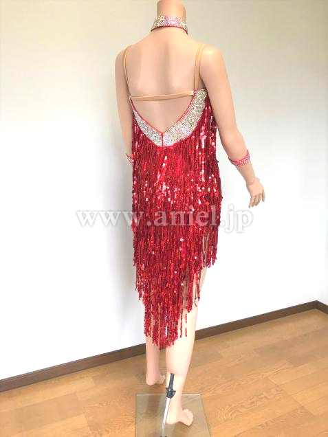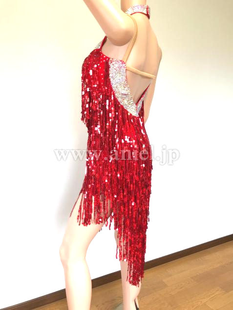 胸元、背中、スパンコールフリンジで見えないボディ部分にも、輝くストーンがあしらわれています。